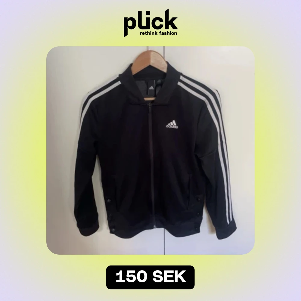 Säljer en snygg svart jacka från Adidas med klassiska vita ränder längs ärmarna. Jackan har en dragkedja framtill och ribbade muddar vid ärmslut och nederkant. Perfekt för träning eller vardagsbruk!