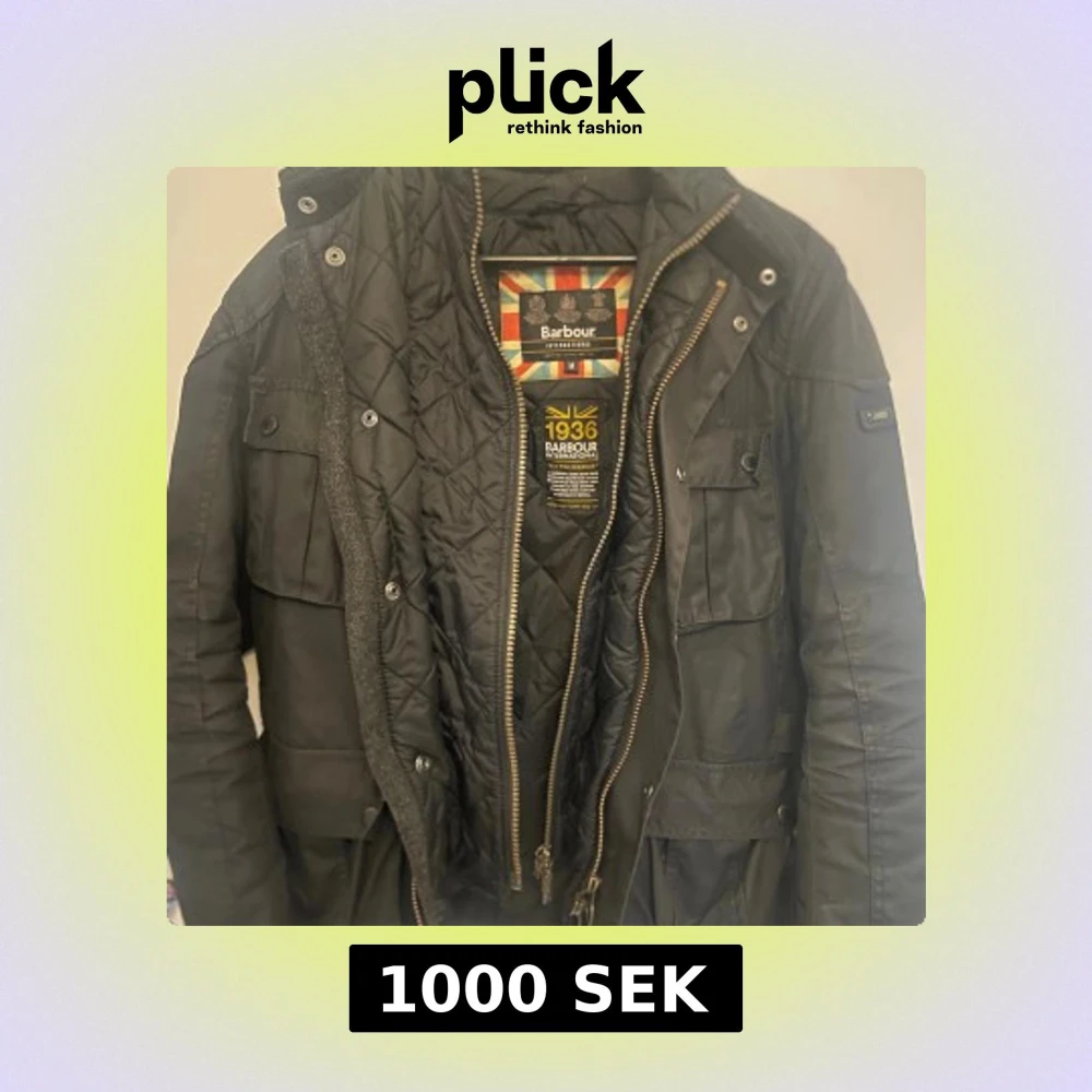 Säljer en svart Barbour International jacka i vaxad bomull med quiltat foder. Jackan har flera stora fickor med knappar, hög krage och dragkedja framtill. Klassisk och stilren modell som funkar perfekt till höst och vinter. Storlek medium.