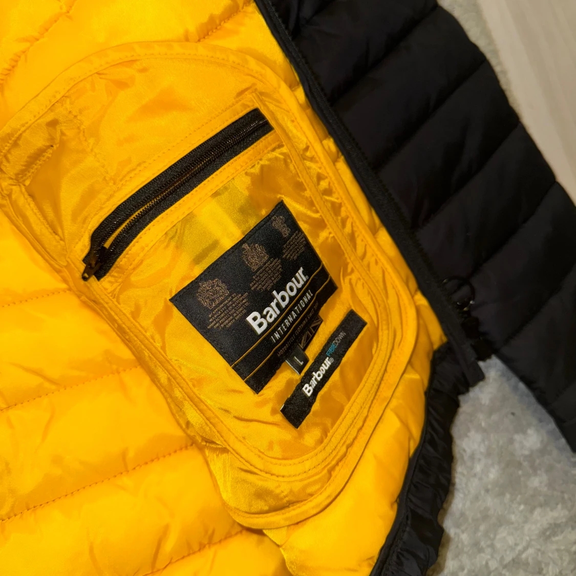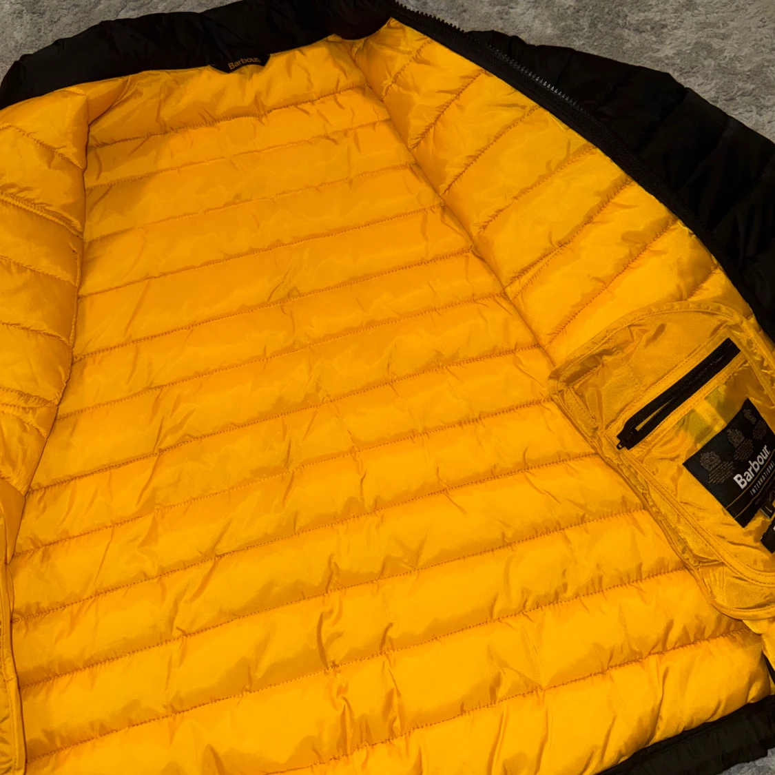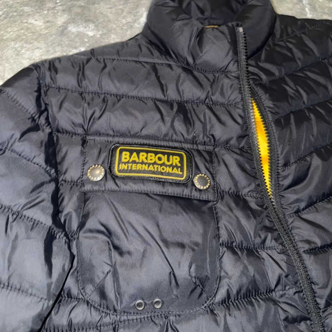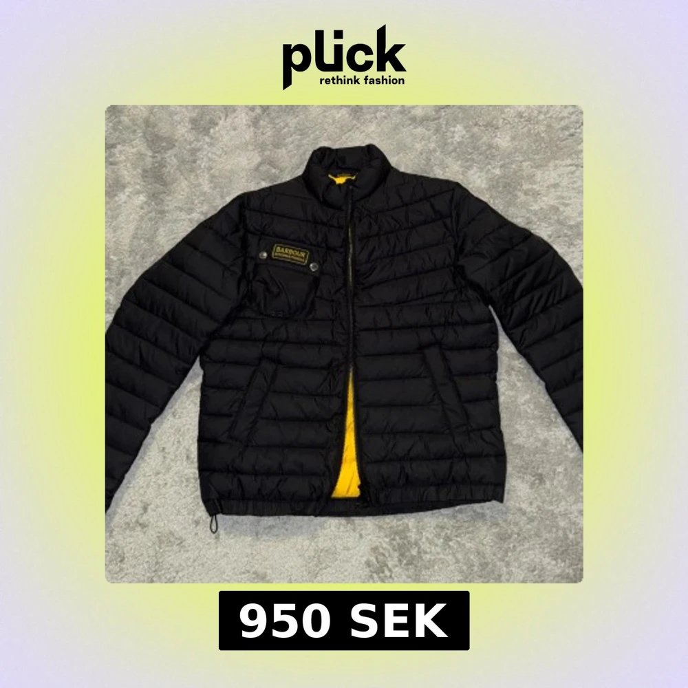 Säljer en svart pufferjacka från Barbour International med gul insida och coolt bröstfack med logga. Jackan har dragkedja, ståkrage och flera fickor. Perfekt för dig som vill ha en lätt och snygg jacka med streetkänsla. Perfekt inför hösten, använd 2 gånger, så gott som nytt