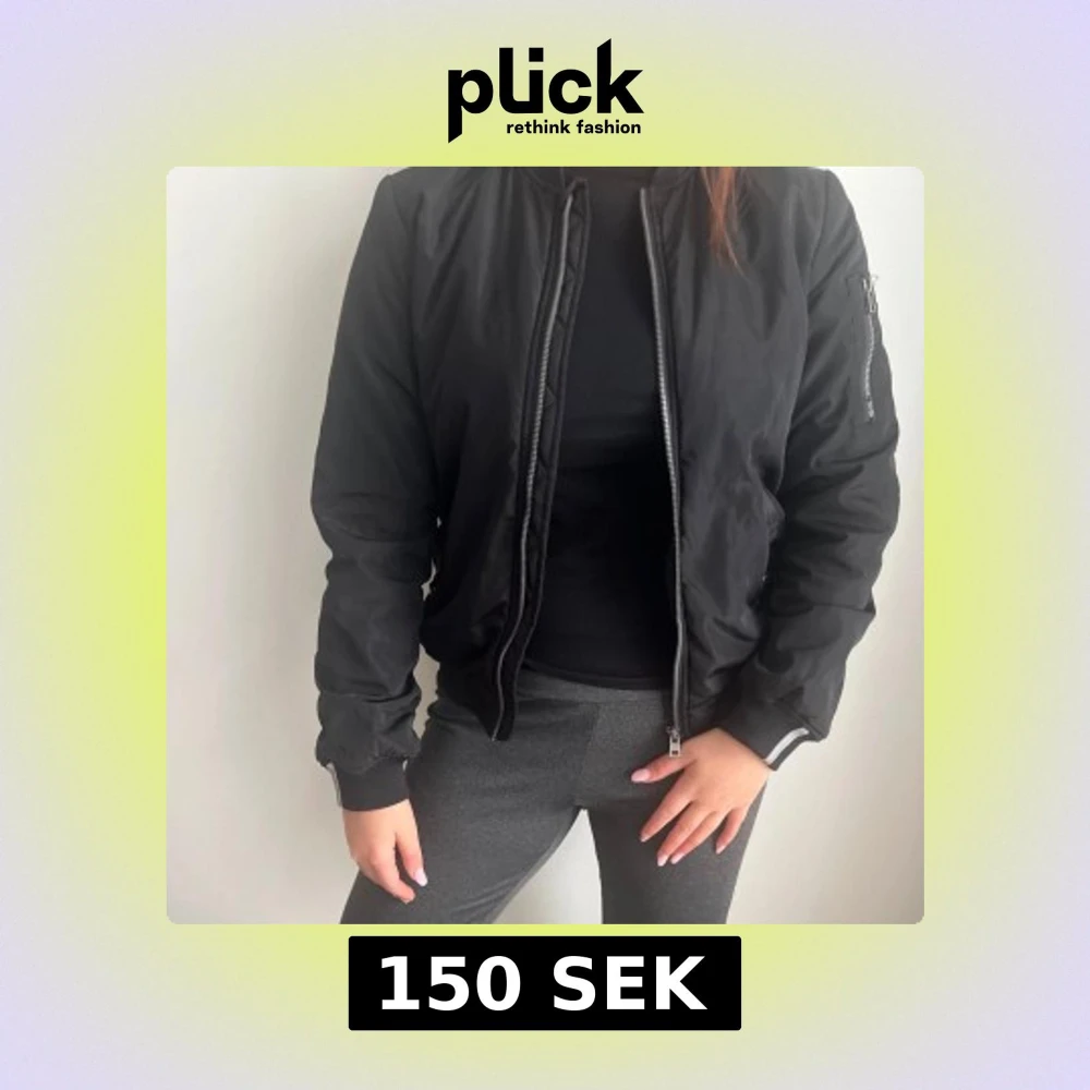 Säljer en svart bomberjacka med dragkedja framtill och ribbade muddar vid ärmslut och midja. Jackan har lång ärm och klassisk bombermodell, perfekt för en cool och avslappnad stil.
