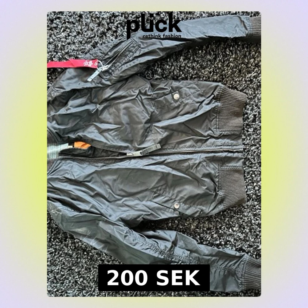 Säljer en svart bomberjacka från Alpha Industries med klassisk röd 'Remove Before Flight'-tag på ärmen. Jackan har ribbade muddar, dragkedja framtill och fickor med knappstängning. Insidan har orange foder för extra edge.