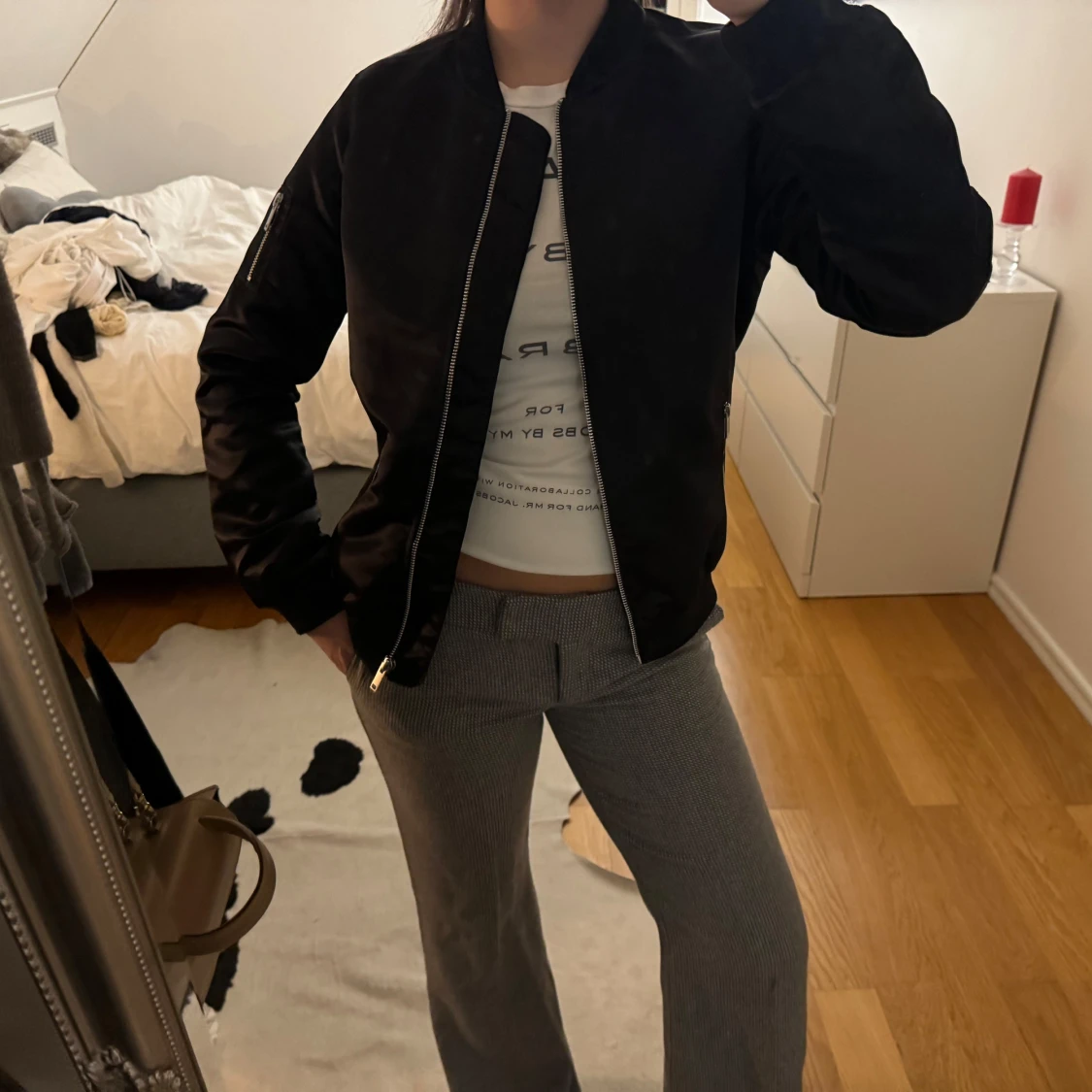 Säljer en stilren svart bomberjacka med dragkedja framtill. Jackan har långa ärmar och en klassisk bomberstil som passar perfekt för en cool och avslappnad look.