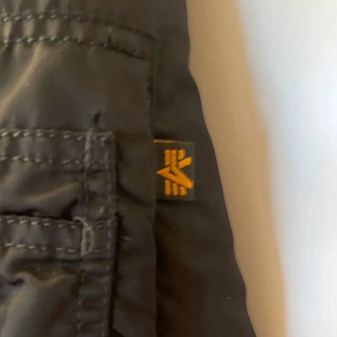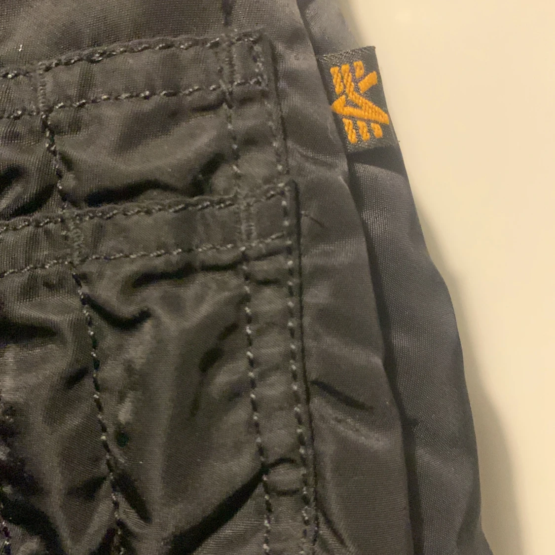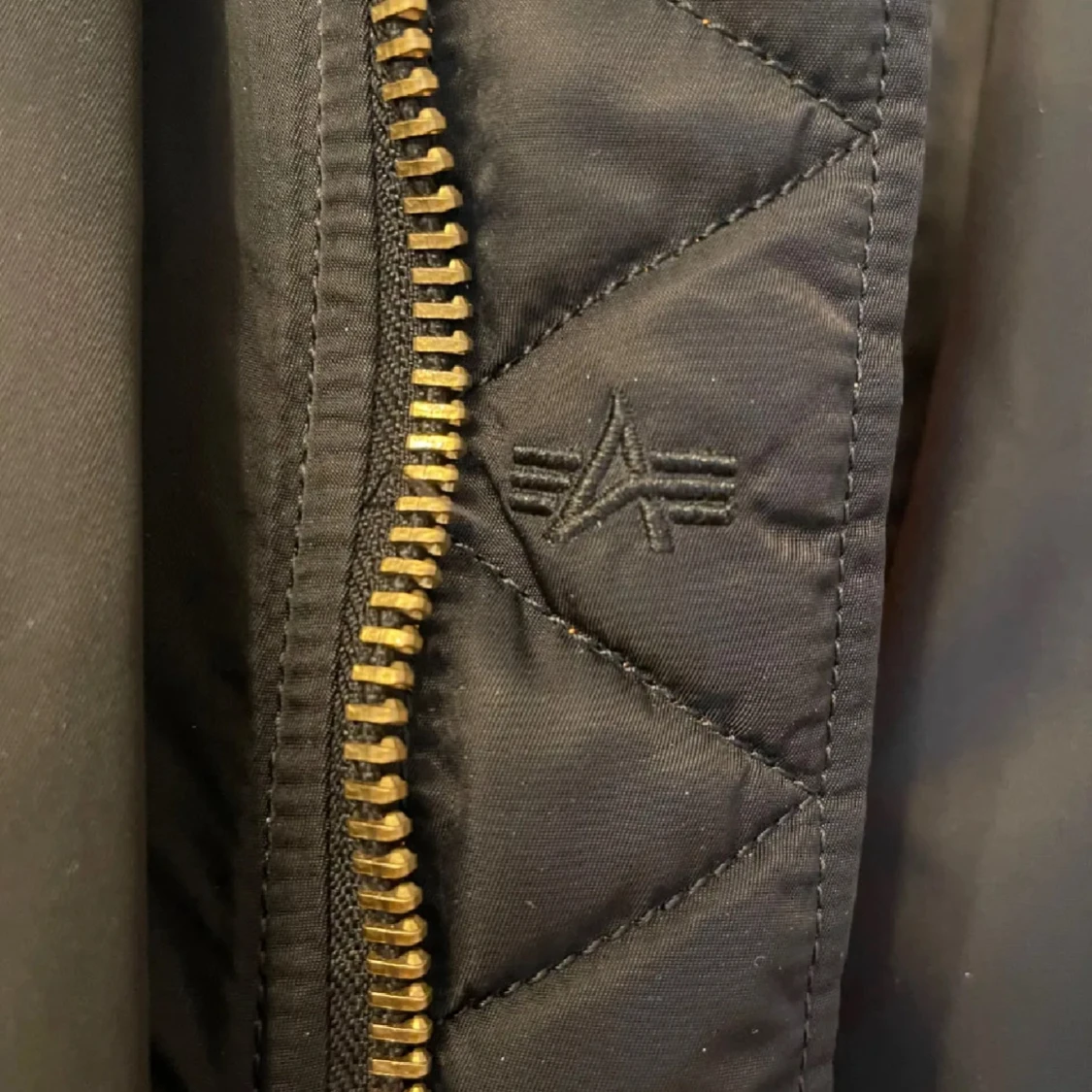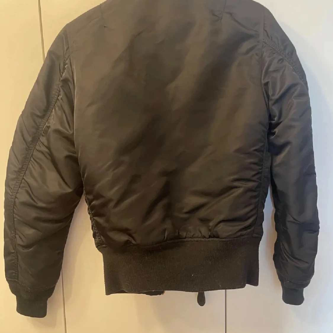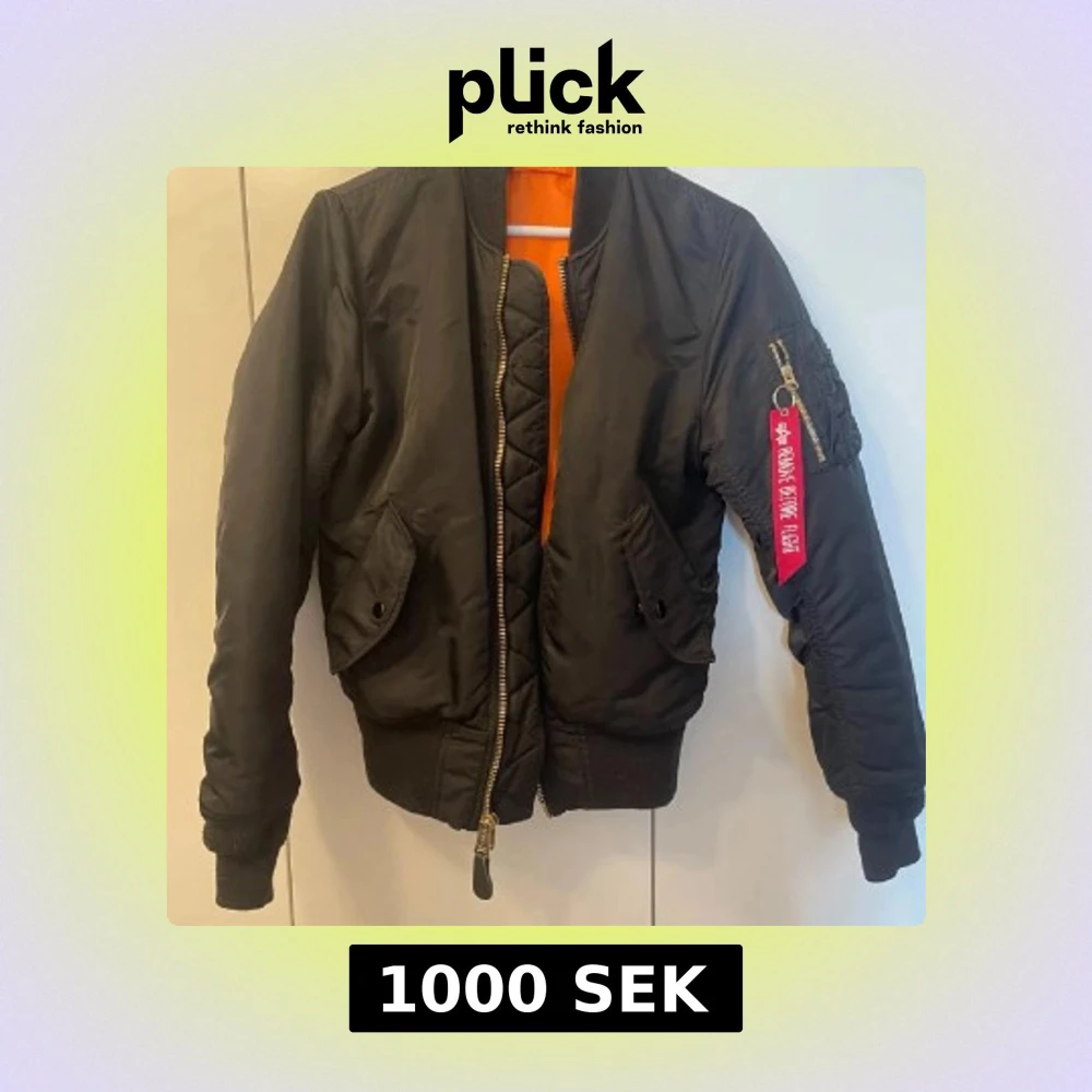 Säljer en svart bomberjacka från Alpha Industries med klassisk orange insida, guldfärgad dragkedja och ikonisk röd tag på ärmen. Jackan har ribbade muddar, två fickor med lock och en ärmficka med dragkedja. Perfekt för dig som gillar streetwear och snygga detaljer. Storleken är S-M