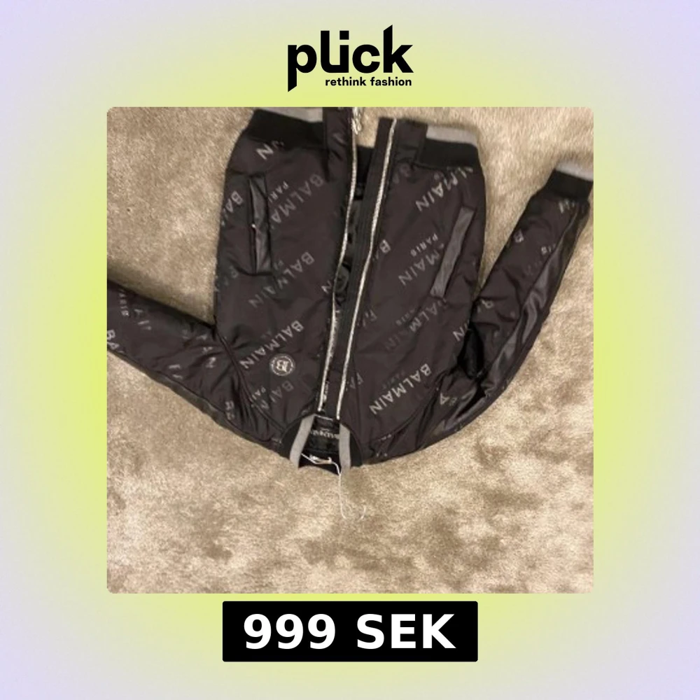 Snygg svart bomberjacka från Balmain med logotyptryck över hela jackan. Den har en dragkedja framtill och ribbade muddar vid ärmslut och nederkant. Perfekt för en stilren look.