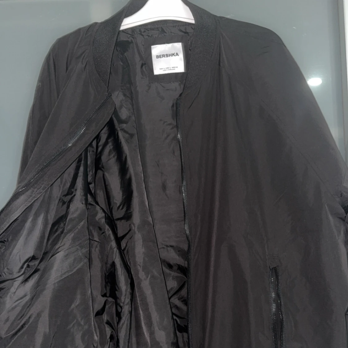 Säljer en stilren svart bomberjacka från Bershka. Jackan har en dragkedja framtill och är i ett lätt och bekvämt material, perfekt för vår och höst. Den har en klassisk bomberstil med ribbade muddar vid ärmslut och krage. Passar både till vardags och fest!