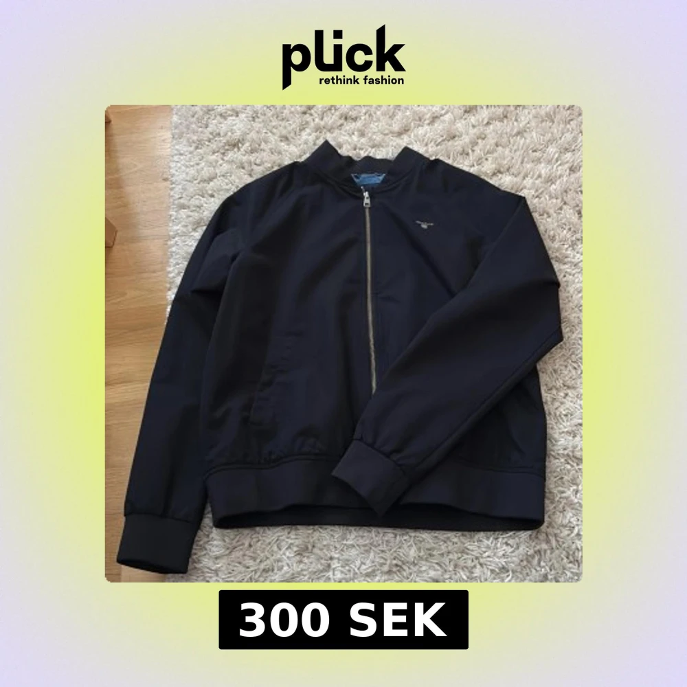 Svart bomberjacka från GANT.. Jackan har dragkedja framtill, två sidofickor och broderad GANT-logga på bröstet. Insidan är ljusblå med stor GANT-tryck. Skriv vid minsta fråga! Väldigt bra skick då den knappt har blivit använd
