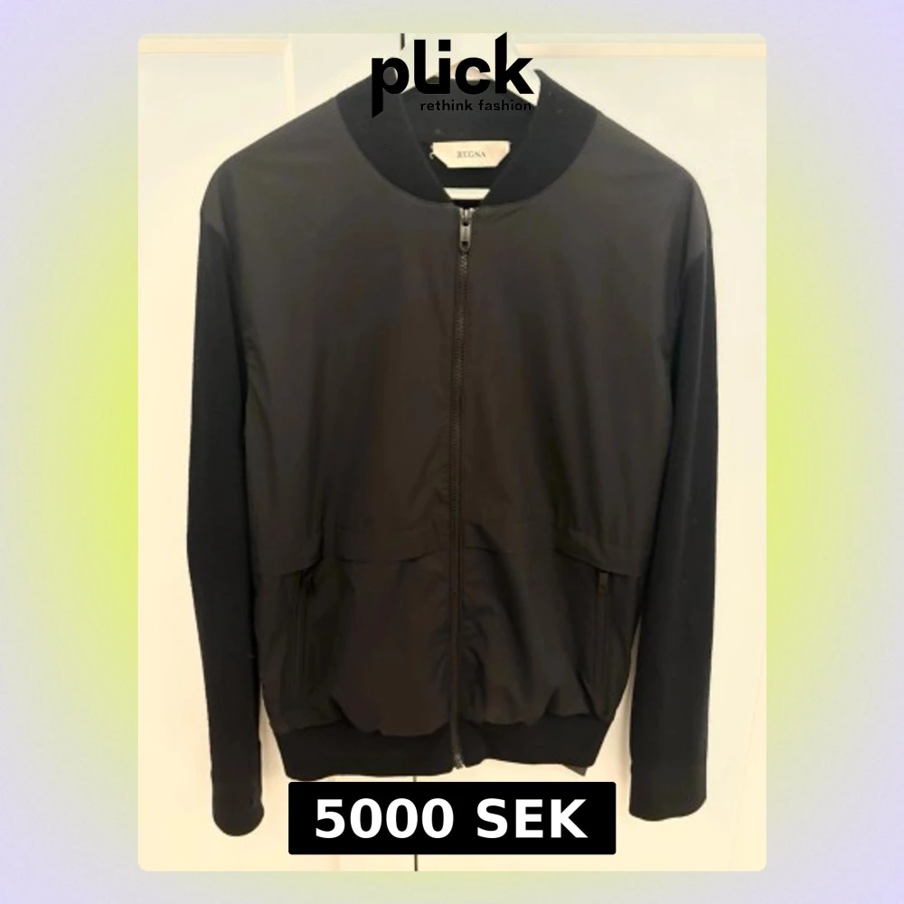 Svart bomberjacka från Zegna med stilren design och ribbad krage. Jackan har dragkedja framtill, två fickor med dragkedja och långärmade ärmar. Materialet är en mix av polyester och stickad textil, vilket ger en snygg kontrast mellan fram- och baksida.