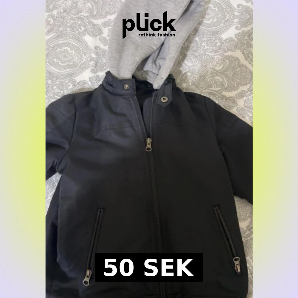 Svart bomberjacka från Ellos med grå huva i sweatshirt-tyg. Jackan har dragkedja framtill, två fickor med dragkedja och snygga detaljer vid kragen och nederkanten. Perfekt för dig som gillar streetstyle och vill ha en cool look.