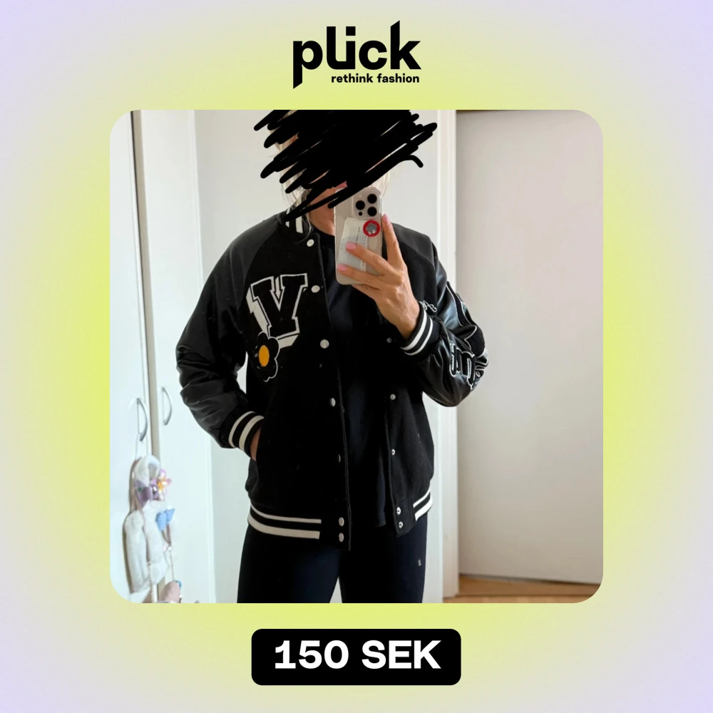 Säljer en svart bomberjacka med coola tryck och detaljer. Jackan har vita knappar och ett stort 'V' med en blomma på framsidan. Ärmarna har texten 'Authenticity' och är gjorda av ett skinnliknande material. Perfekt för höst och vår! Liten skada på axeln se bild