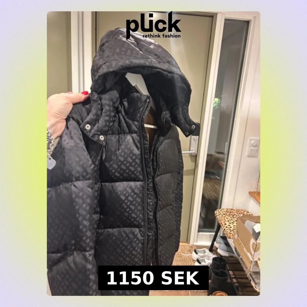 Säljer en svart jacka från BOSS med snyggt geometriskt mönster över hela jackan. Jackan har huva, dragkedja och insida i beige och vitt. 12 år/ XS