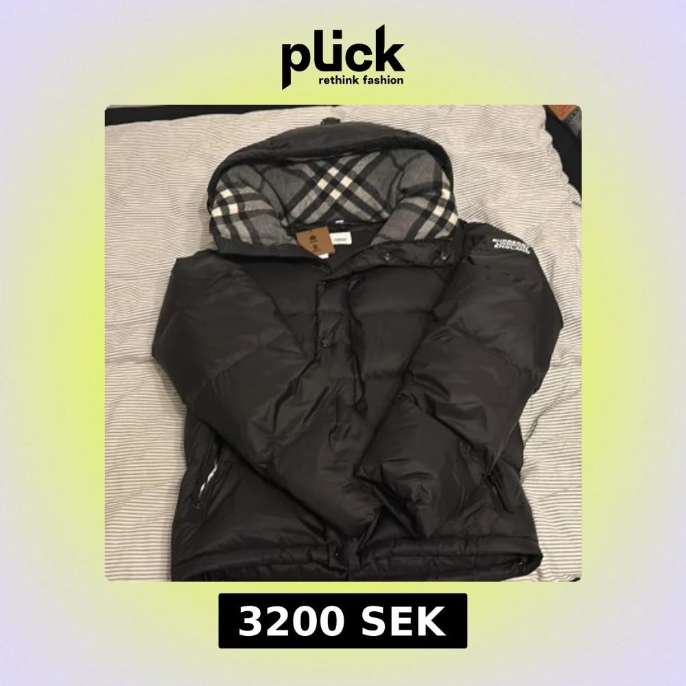 Säljer en svart dunjacka från Burberry med klassiskt rutigt foder i huvan. Jackan har dragkedja och stora fickor, samt en tydlig Burberry-logga på armen. Jackan är oanvänd och i nytt skick, perfekt till kalla dagarna.