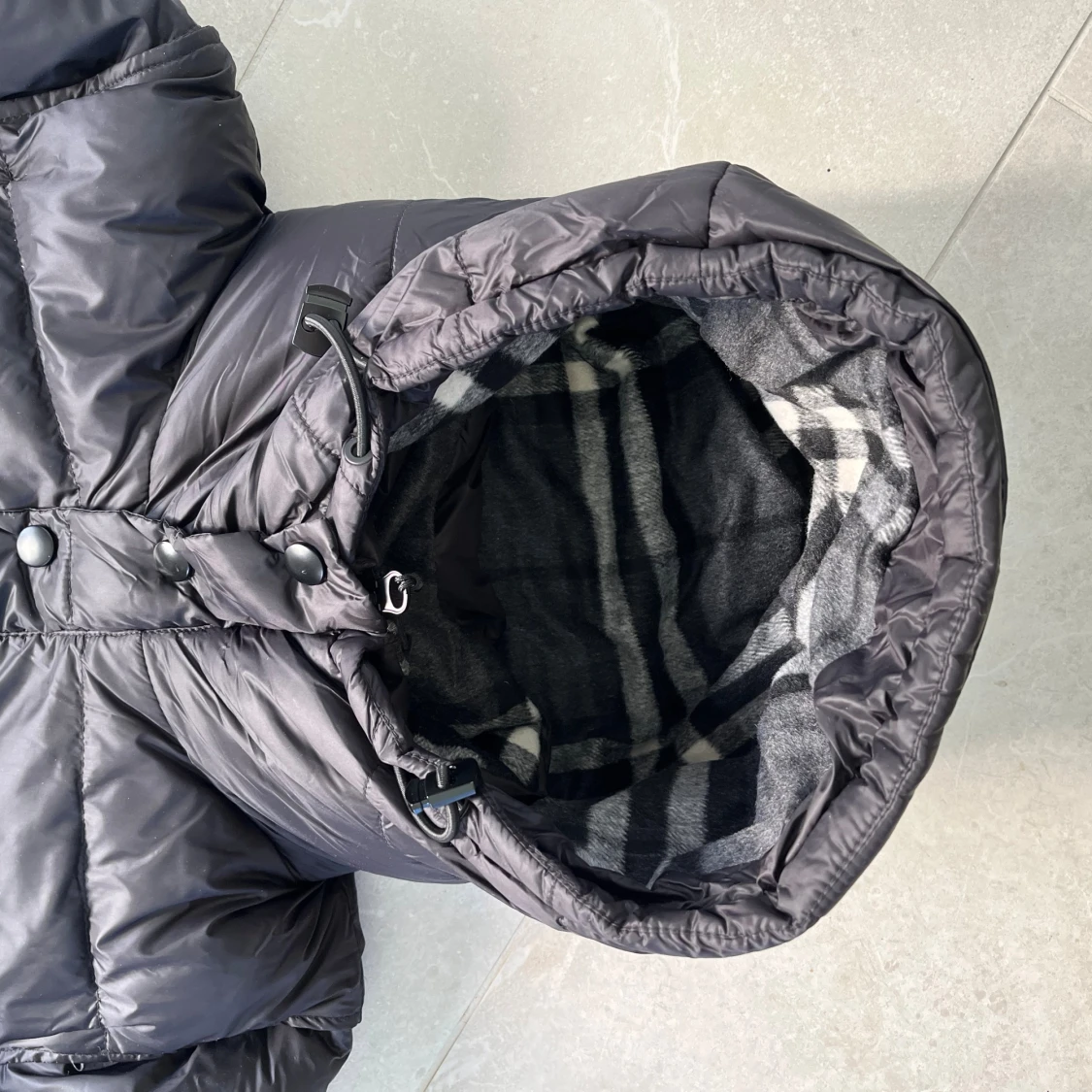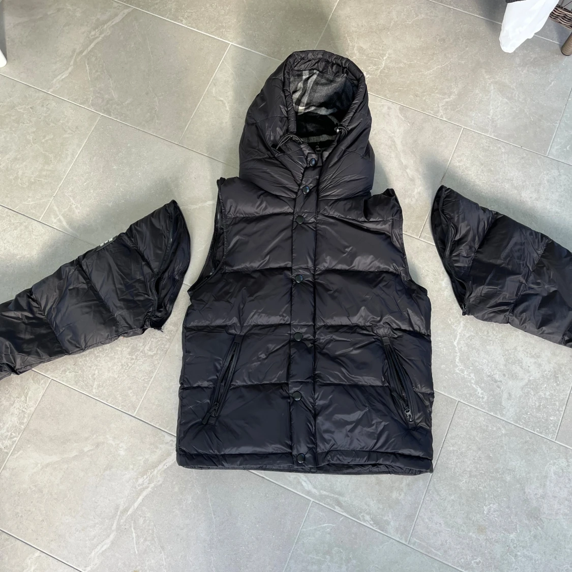 Svart pufferjacka från Burberry London England med avtagbara ärmar, så du kan bära den som väst. Jackan har quiltad design, dragkedjor på fickorna, tryckknappar och en stor huva med rutigt foder. Perfekt för kalla dagar och riktigt snygg streetstil.