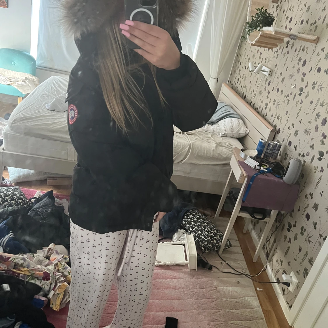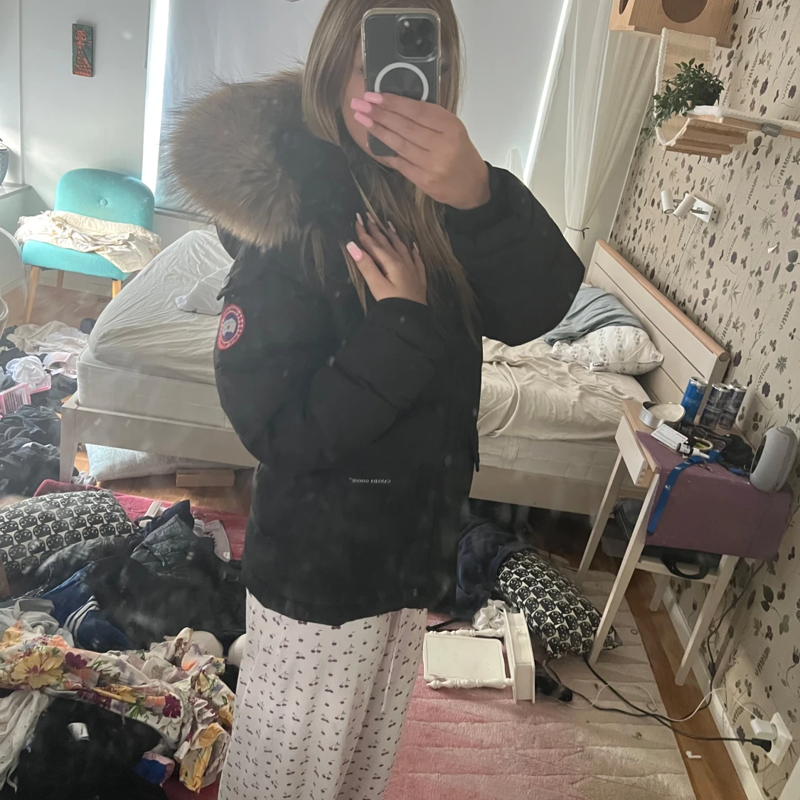 //Köp helst med PostNord!// Säljer en svart dunjacka från Canada Goose med stor fluffig päls runt huvan. Har inte andvänt jackan alls mycket så den är väldigt bra skick och är inte sönder någonstans. Jackan är äkta och är köpt på deras hemsida. Nypris: 10000+ /Kan tänka mig gå ner i pris vid snabb äffar!💞