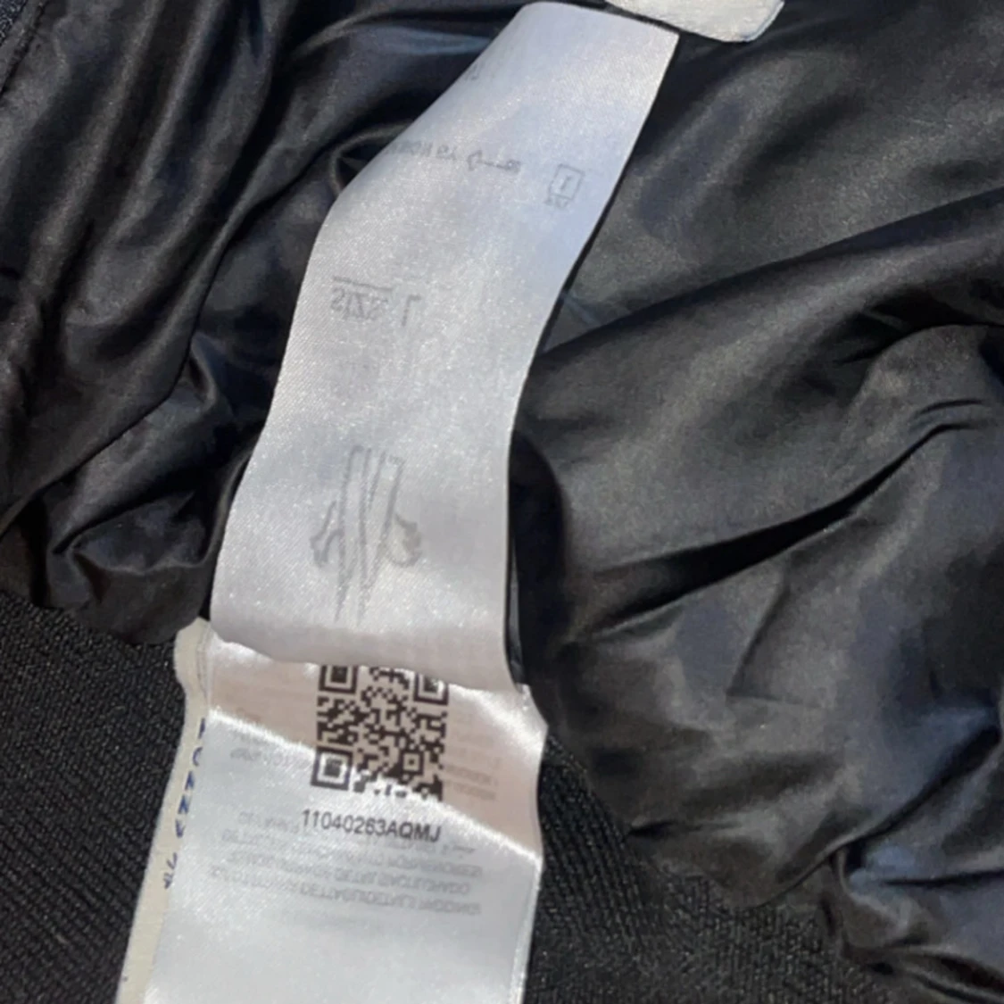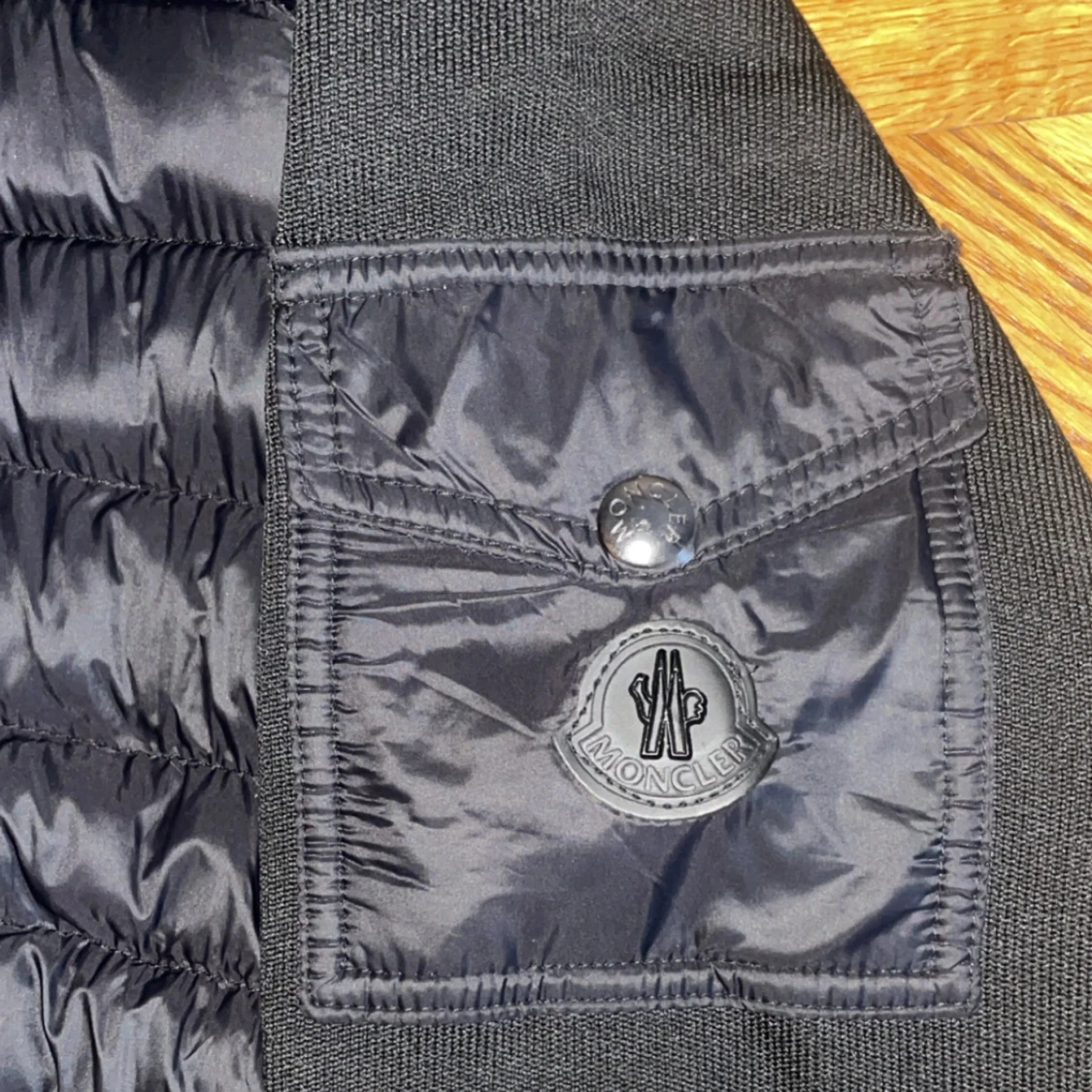 Svart cardigan från Moncler med quiltad framsida och slätare ärmar. Jackan har dragkedja framtill, två sidofickor med dragkedja och en ficka med Moncler-logga på ärmen. Materialet är polyester och syntet, perfekt för kyliga dagar.