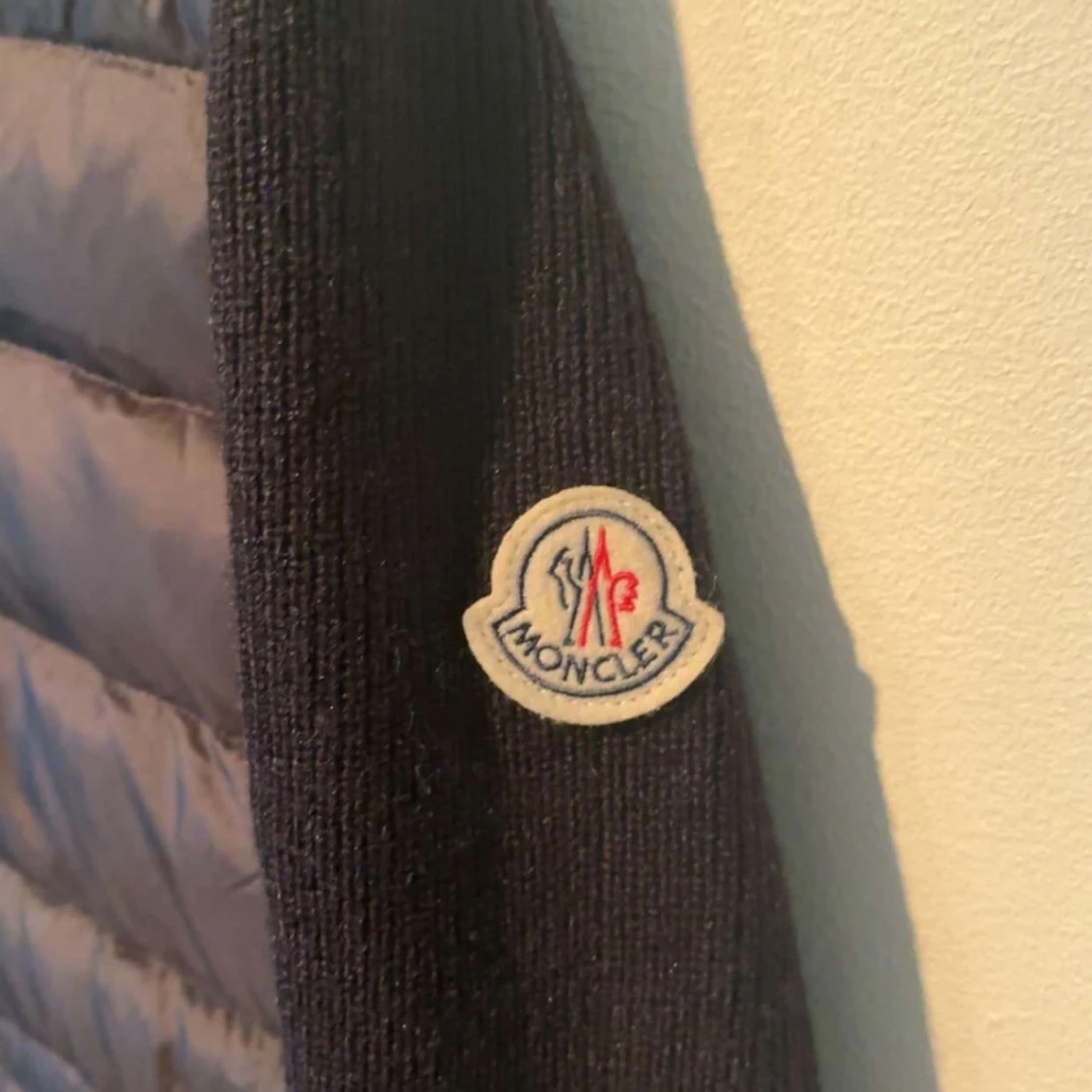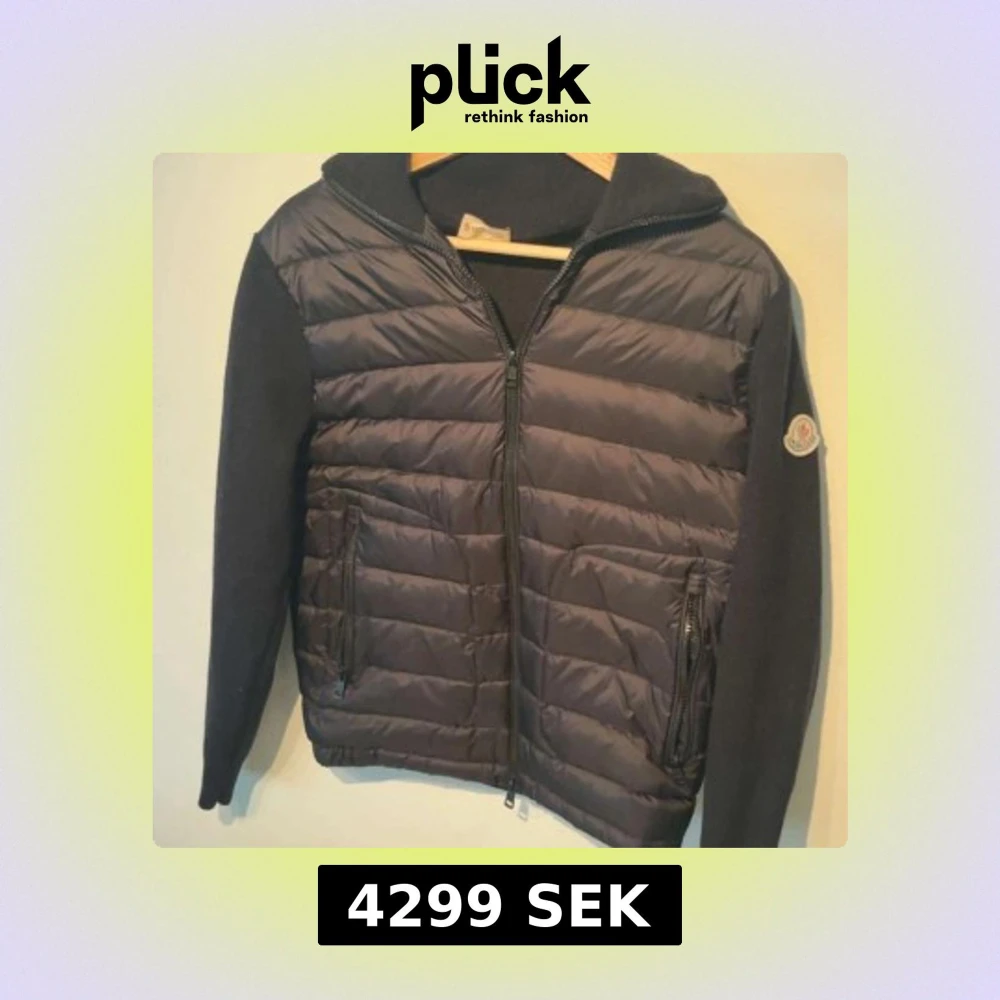 Svart dunjacka från Moncler med stickade ärmar och huva. Jackan har quiltad framsida, två fickor med dragkedja och Moncler-logga på ärmen. Perfekt för dig som vill ha en snygg och varm jacka med street vibe och exklusiv känsla.