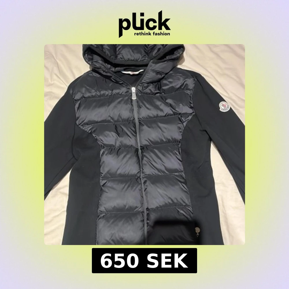 Säljer en Svart Cardigan från Moncler med huva och quiltad front. Jackan har långärmade släta ärmar, dragkedja framtill och Moncler-logga på vänster ärm.