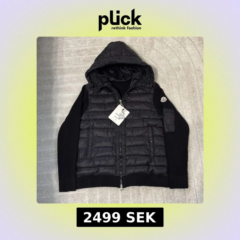 Säljer en svart pufferjacka från Moncler i storlek M. Jackan har quiltad front i glansig polyester, stickade ärmar, huva och dragkedja framtill. Klassisk Moncler-logga på ärmen och coola detaljer som innerficka med serietidningsmotiv.