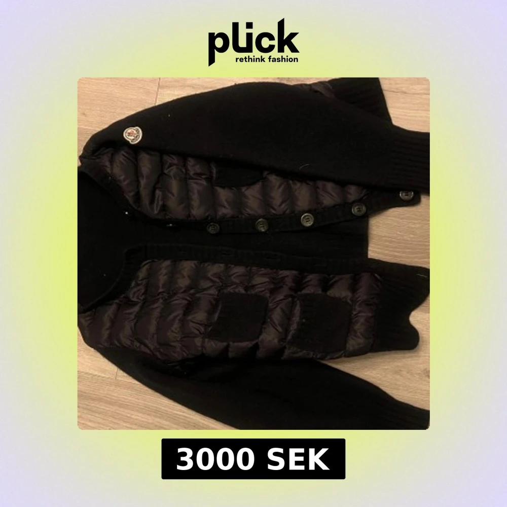 Snygg svart cardigan jacka från Moncler med knappar framtill, perfekt för sommaren . Köpt från vinted. Den är i bra skick och används fåtalsgånger. Den jag köpte den av har råkat krymt den i tvätten så den motsvarar storlek Xs. Men jag som har S kan ha den! Ena armen är lite större och puffigare än den andra men fortfarande jätte fin