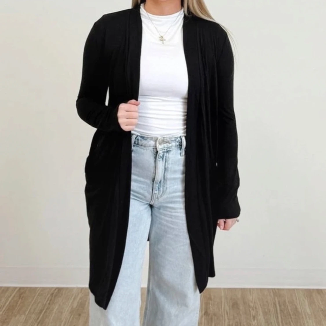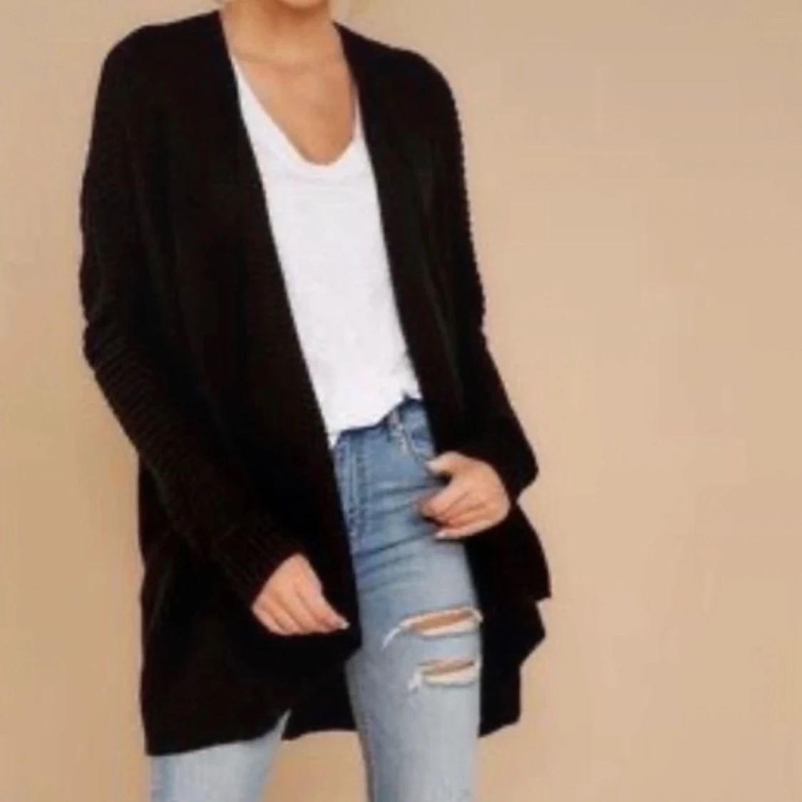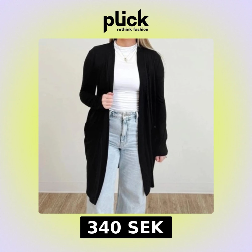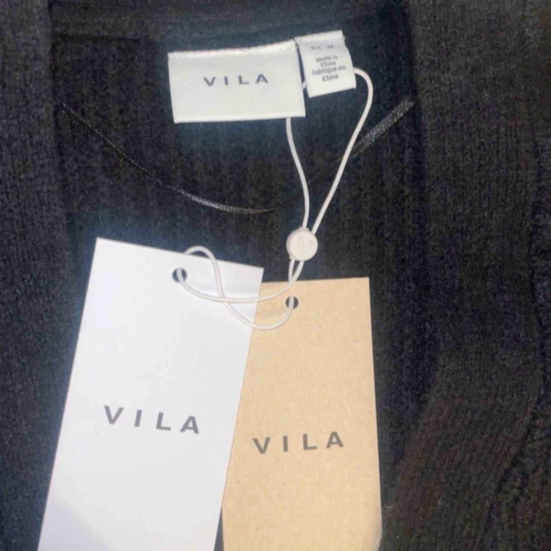 Säljer en stilren svart cardigan jacka från Vila. Den har en öppen design och långa ärmar. Prislapp kvar och inga defekter helt ny storlek M