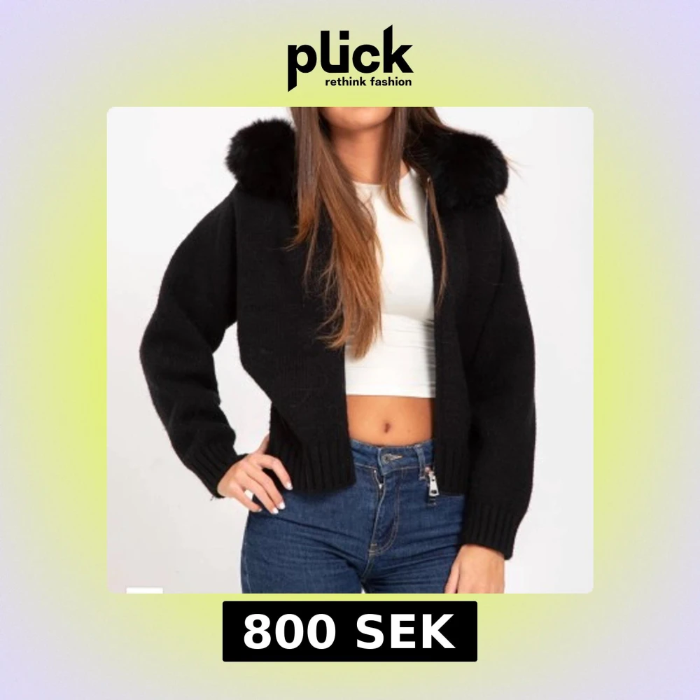 Svart cardigan jacka med fluffig päls runt luvan och grov ribbad mudd vid ärmslut och nederkant. Jackan är croppad och har lång ärm, perfekt för att ge en chill men ändå stylish vibe. Materialet är stickat och pälsen ger extra edge till looken. Den är lite noppriga vid armarna annars inget. Kan skicka mera bilder om de behövs. Original pris är ca 2000. Den är också hyfsat varm. Pris kan diskuteras