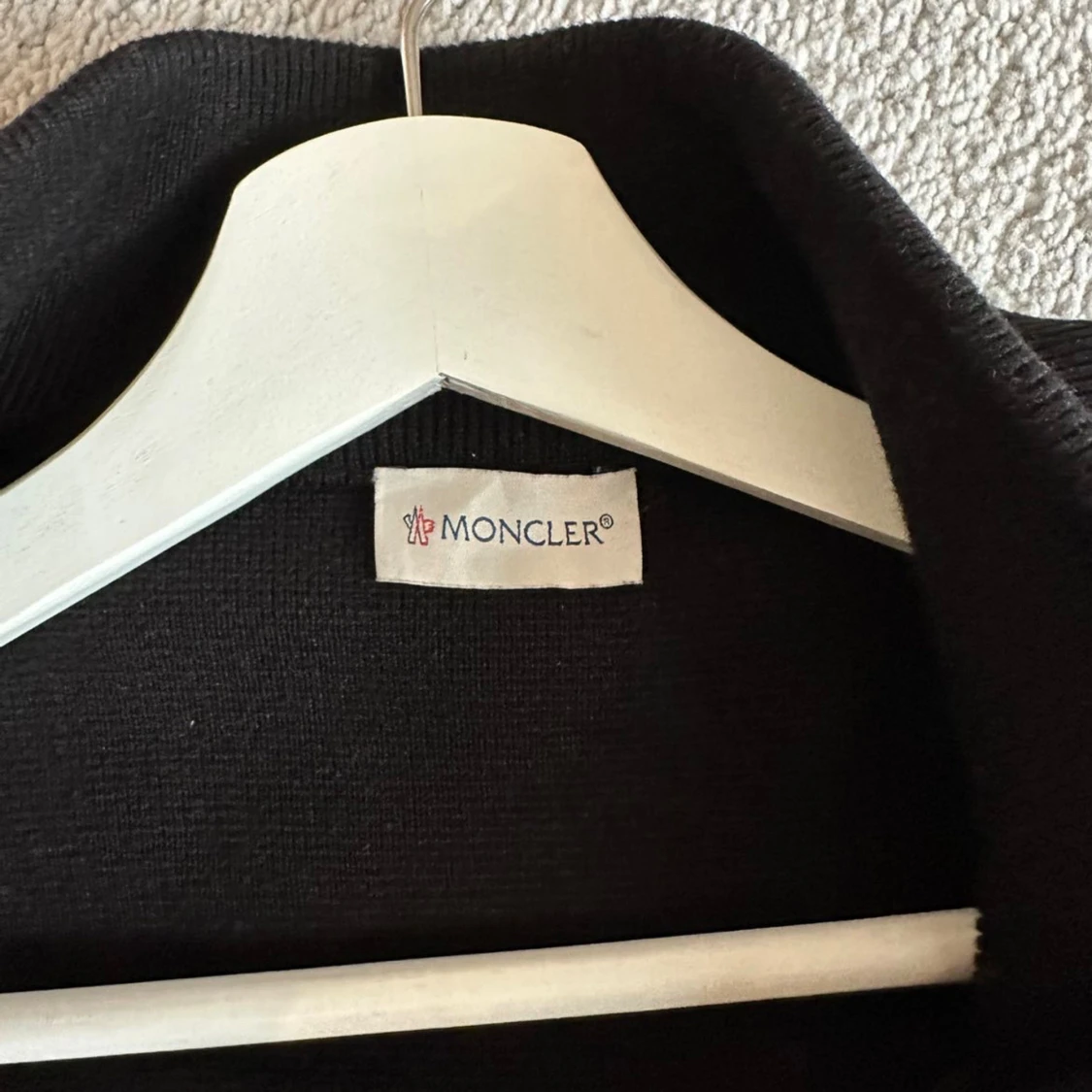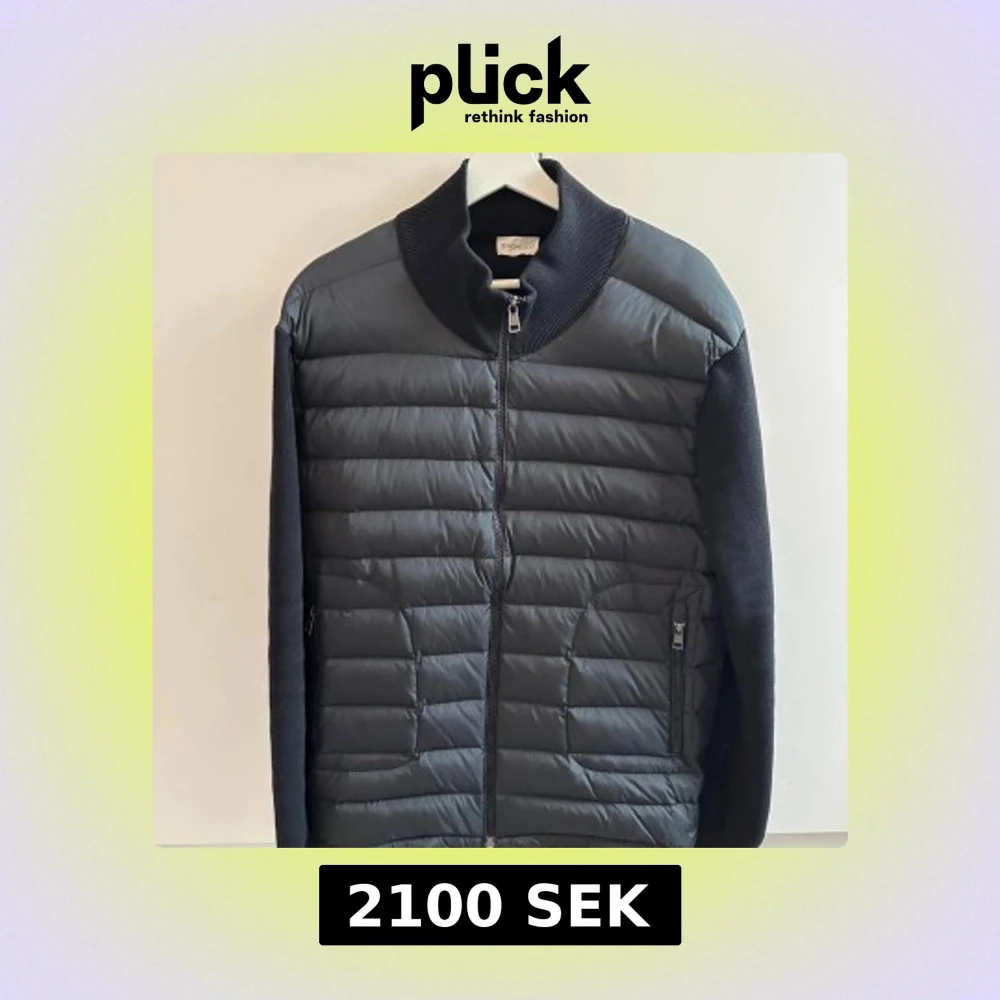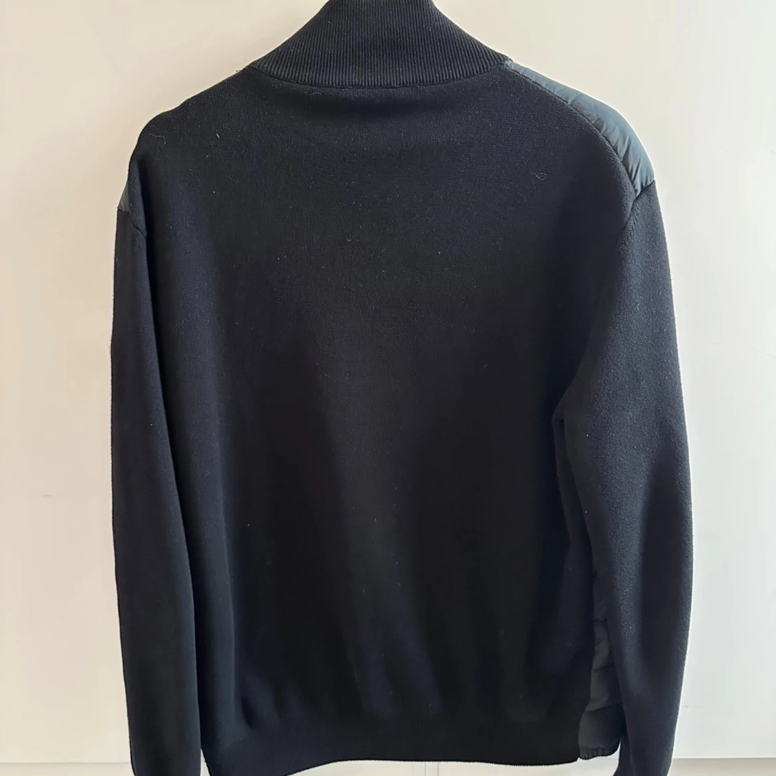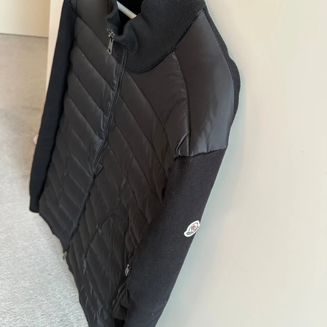Svart pufferjacka från Moncler med quiltad framsida och stickade ärmar och rygg. Jackan har hög krage, dragkedja framtill och två fickor med dragkedja. Snygg och stilren design med diskret Moncler-logga på ärmen. Om någon är sugen på byta är det bara sicka bild