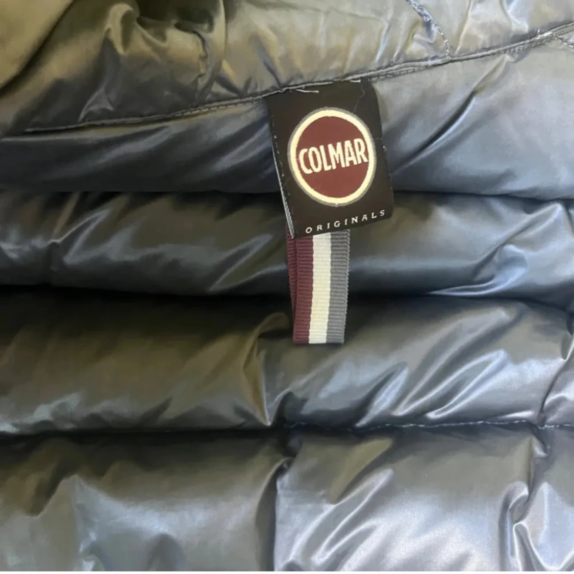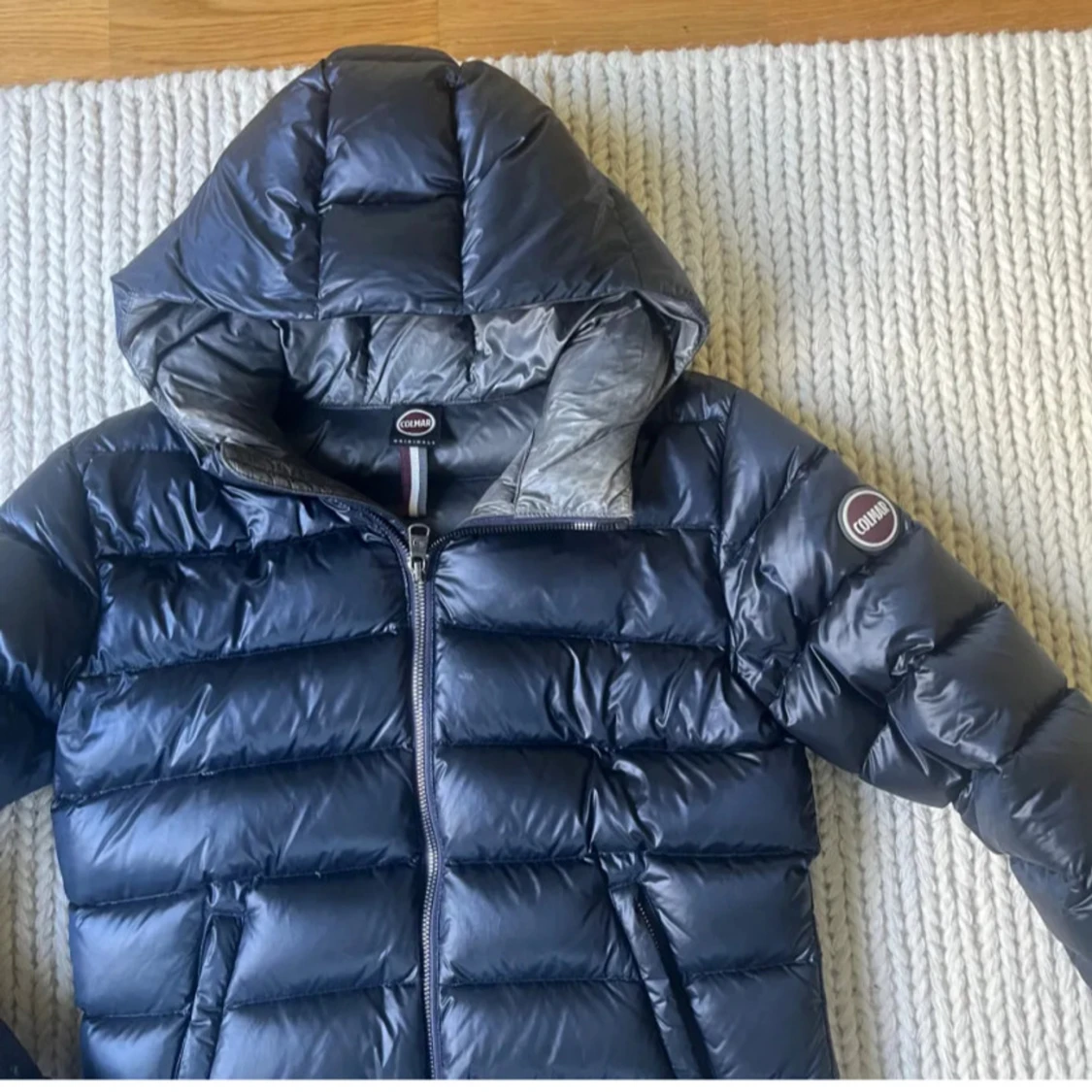 Snygg svart/mörkblå pufferjacka från Colmar med glansig finish och huva. Jackan har quiltad design, dragkedja framtill och Colmar-logga på ärmen. Perfekt för kalla dagar och riktigt skön att bära. Passformen är normal och jackan är lätt att matcha med olika outfits.