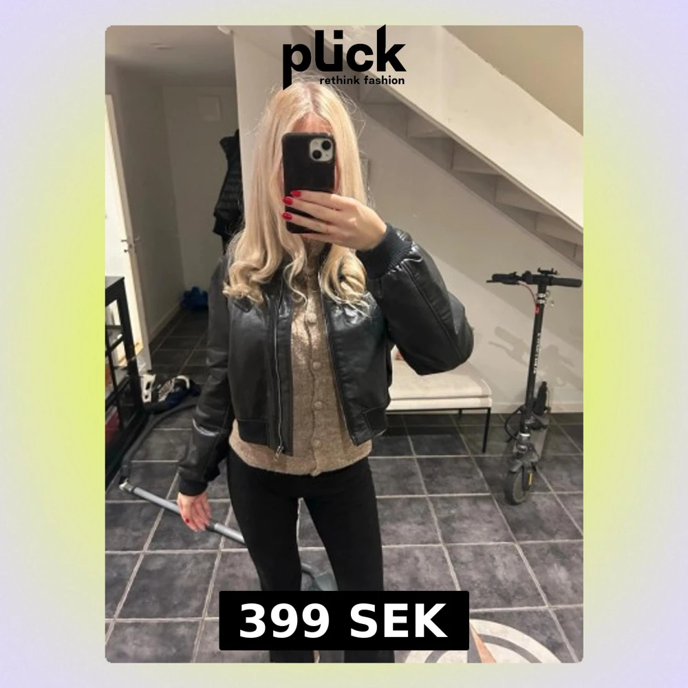 Säljer en svart bomberjacka i skinn med ribbade muddar vid ärmslut och midja. Jackan har dragkedja framtill och en croppad passform som ger en cool och modern look. Perfekt till höst och vinter för dig som vill ha en stilren och edgy jacka. Väldigt svår att få tag på❤️storleken är L men sitter som en S