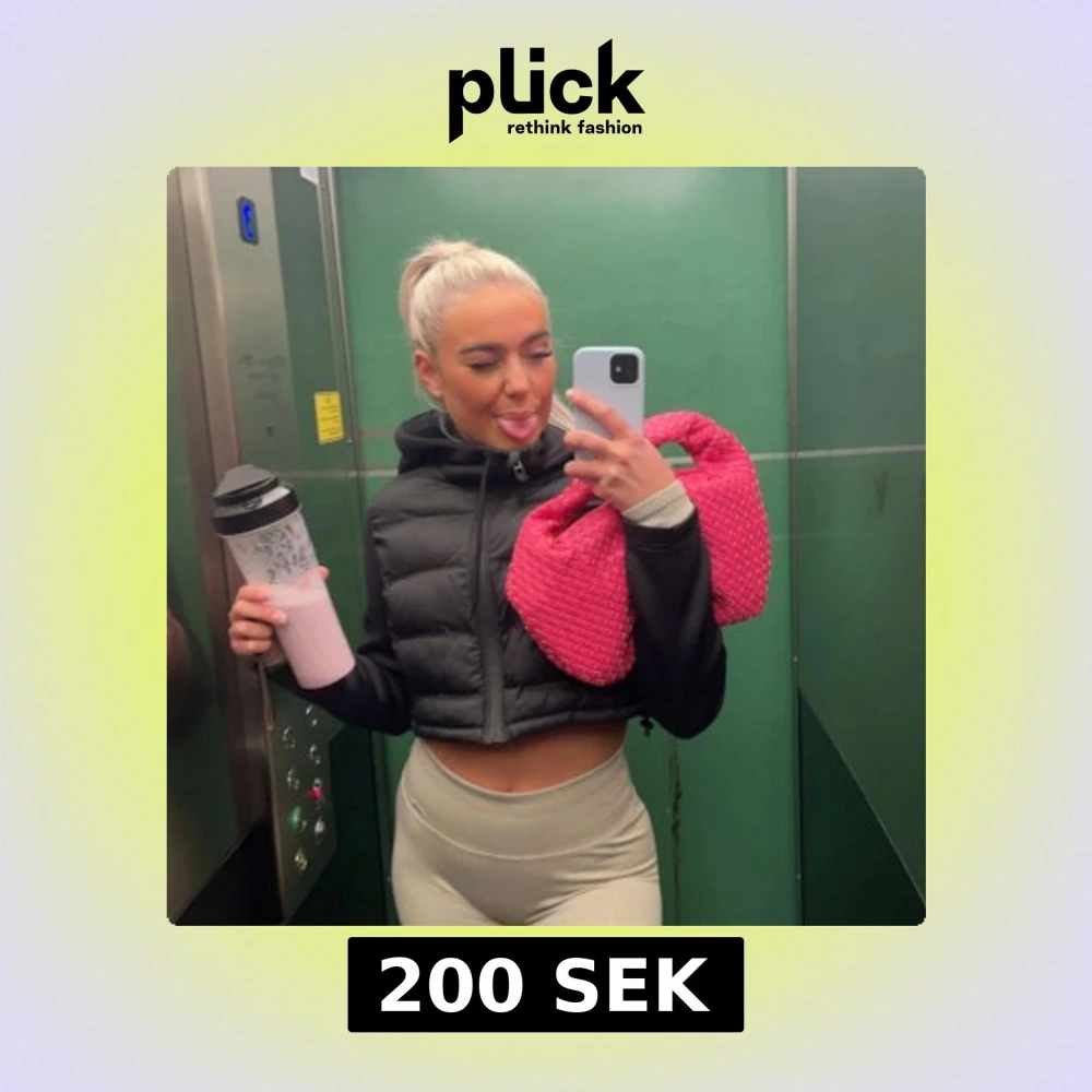 Säljer en svart croppad dunjacka med hög krage och dragkedja framtill. Perfekt att slänga över en hoodie eller långärmad tröja för en sportig look.