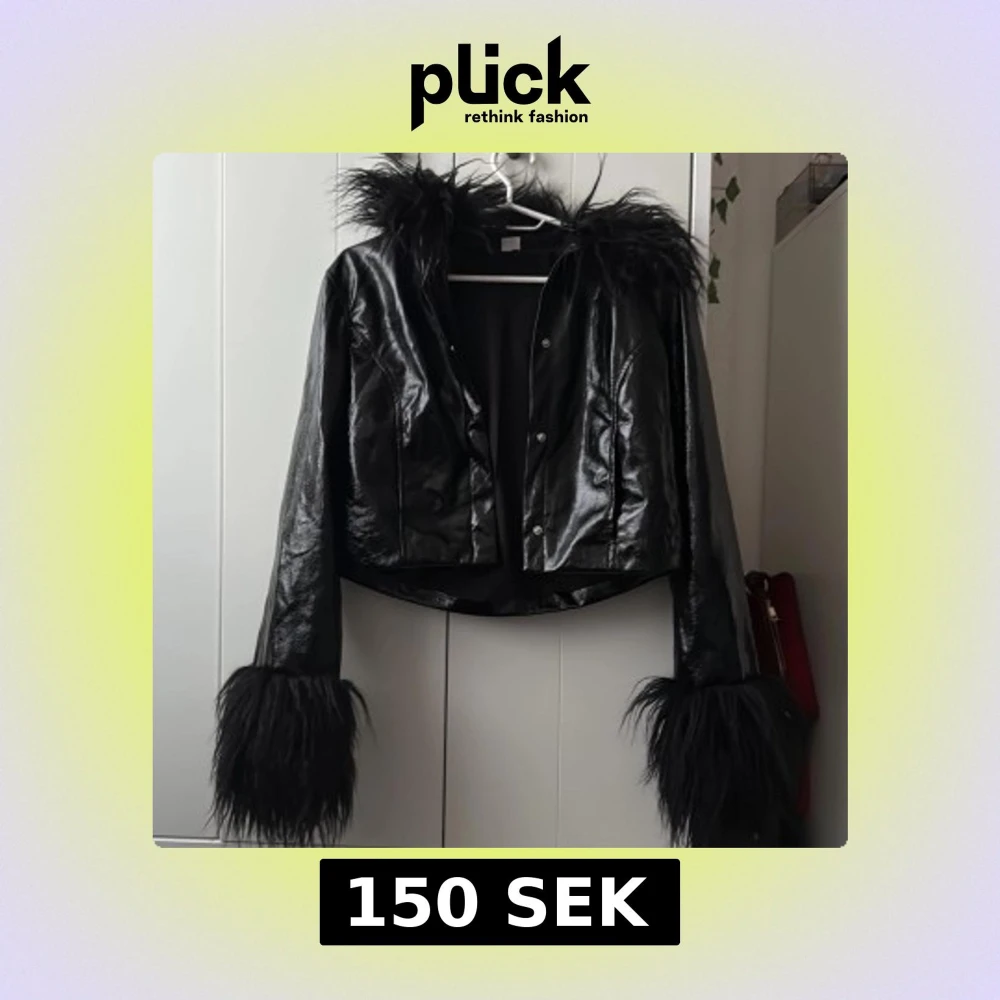 Säljer en svart, glansig croppad jacka från H&M divided med fuskpälsdetaljer vid krage och ärmslut. Jackan har långa ärmar och stängs med tryckknappar framtill. Perfekt statement-plagg för dig som vill sticka ut.