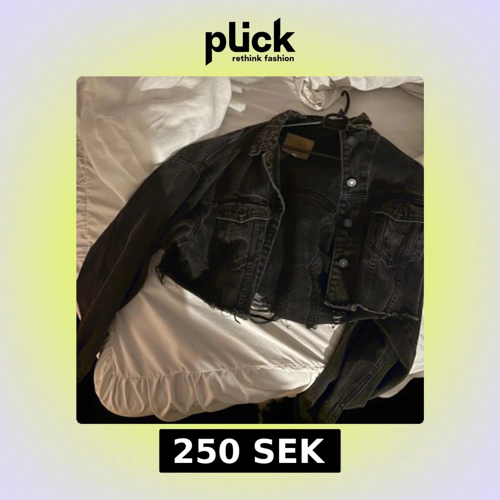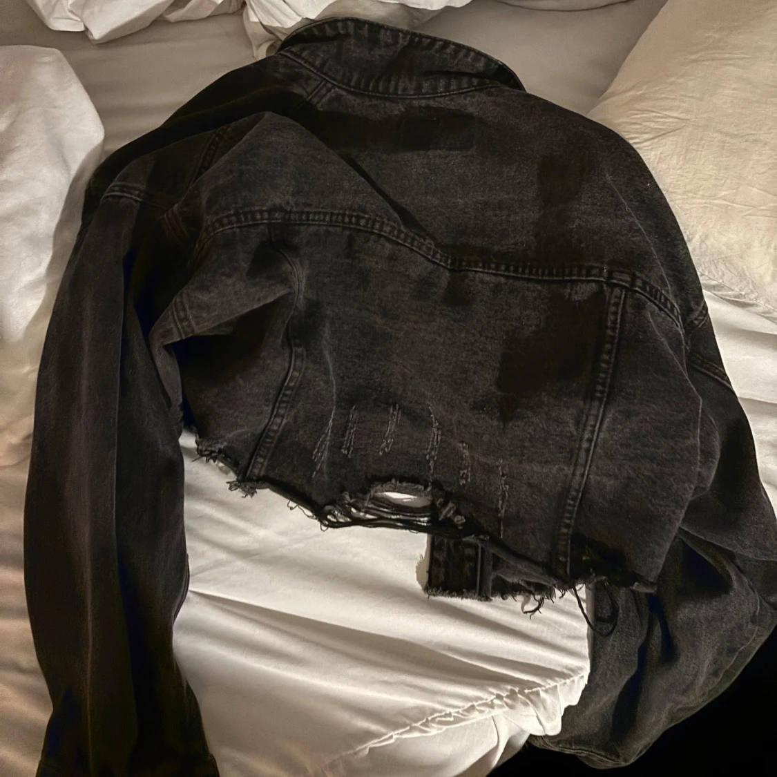 Säljer en svart croppad jeansjacka med råa kanter och knappar framtill. Jackan har en cool, avslappnad stil och är perfekt för att lägga till en edgy touch till din outfit. Den har långa ärmar och klassiska bröstfickor.