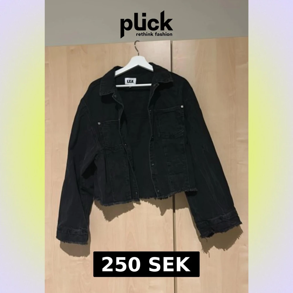 Svart croppad jeansjacka från LXA i storlek 38. Jackan har rå kant nedtill, klassisk krage och två bröstfickor med knappar. Långärmad och loose fit, perfekt för dig som gillar en chill och edgy stil.