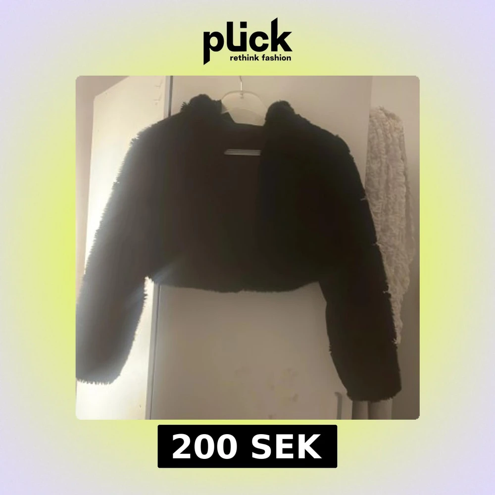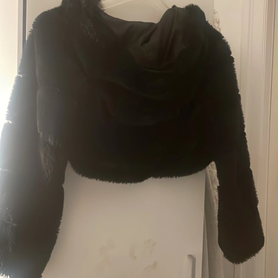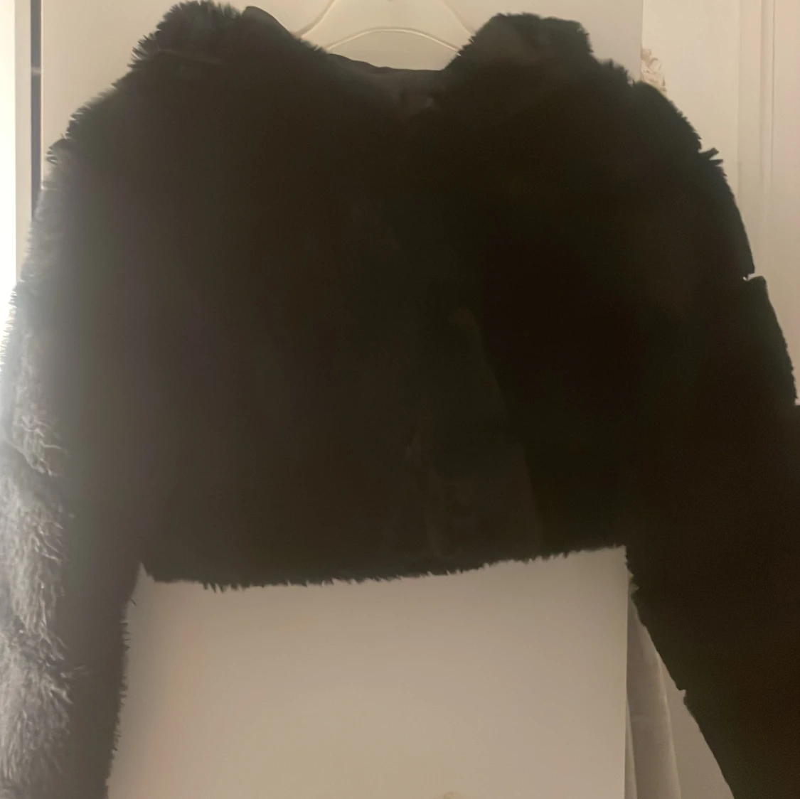 Säljer en svart, croppad pälsjacka med huva. Jackan har lång ärm och är gjord i mjukt fuskpälsmaterial som ger en lyxig och trendig vibe. Den håller dig varm under kyliga dagar. Passformen är normal och jackan är utan synliga knappar eller dragkedja. Den har 3smpa knappar som inte syns