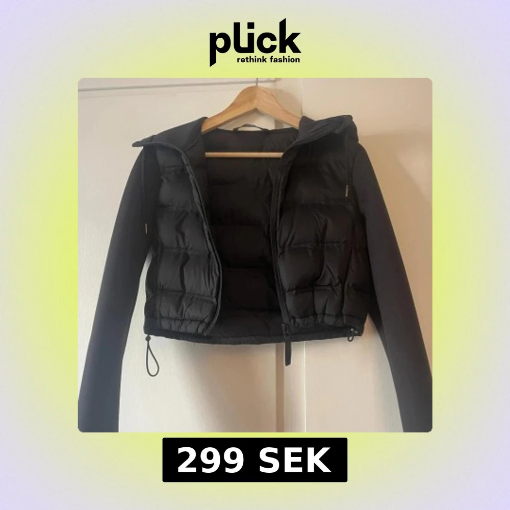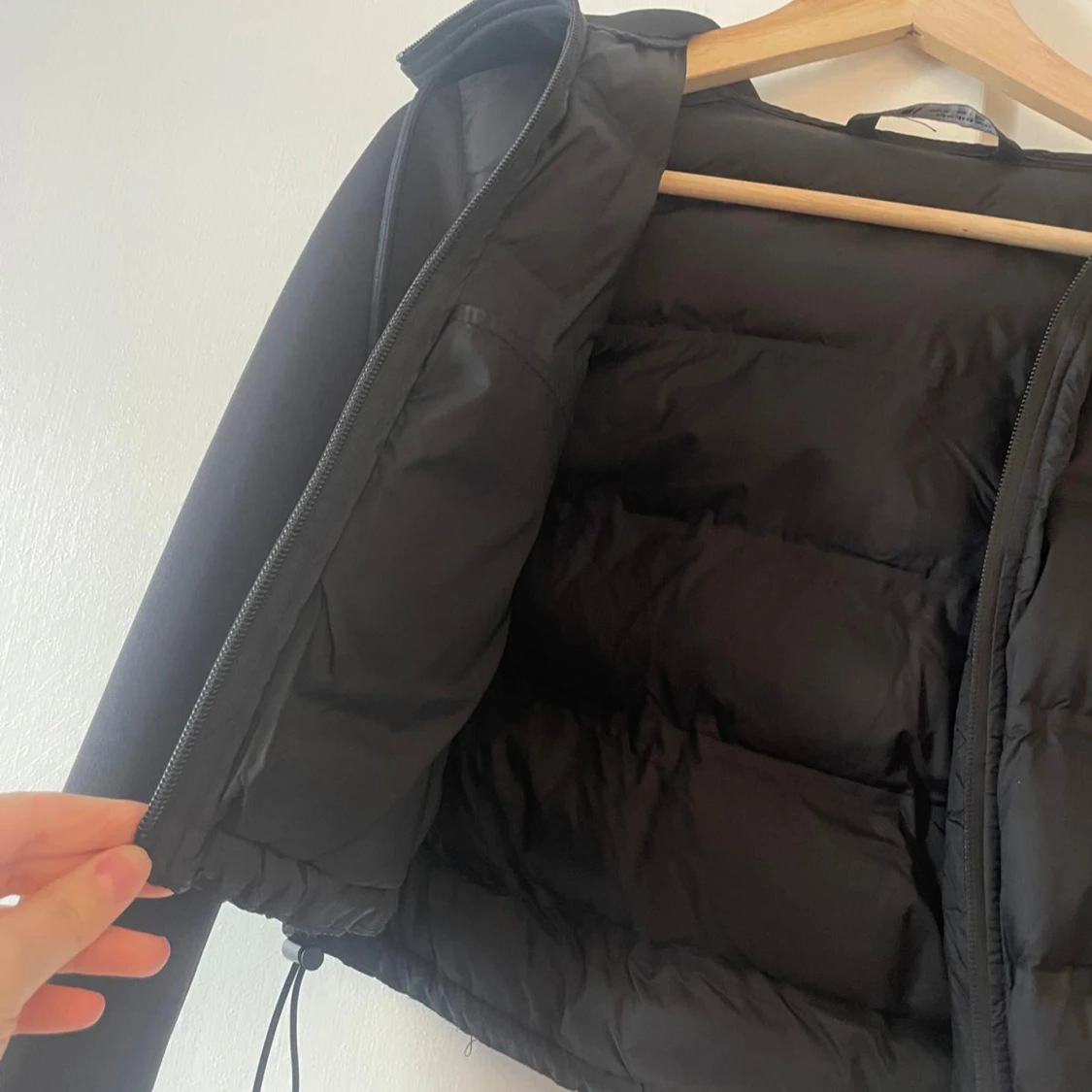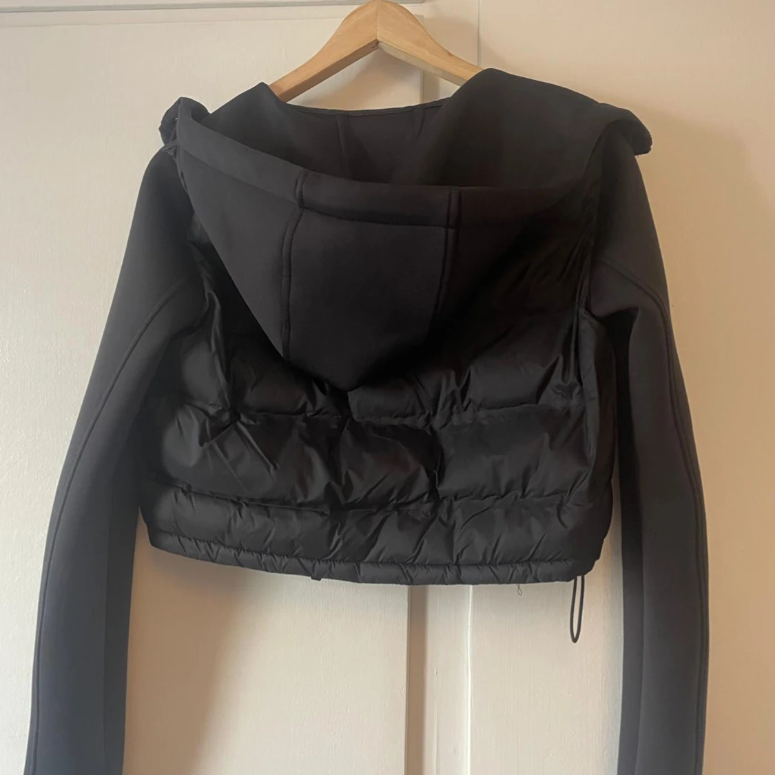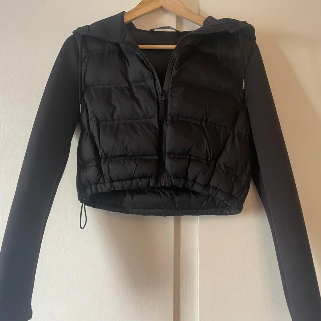 Snygg svart croppad pufferjacka från Zara med dragkedja och huva. Storlek XS Knappt använd