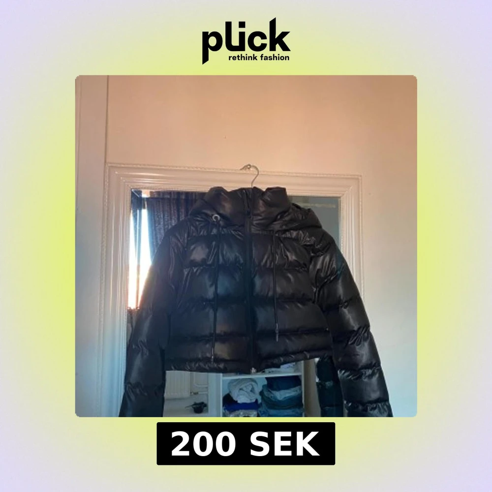 Säljer en svart croppad pufferjacka från Pickk Upp. Jackan har huva med snörning, dragkedja framtill och en glansig finish. Perfekt för dig som vill ha en trendig och varm jacka med cool attityd.