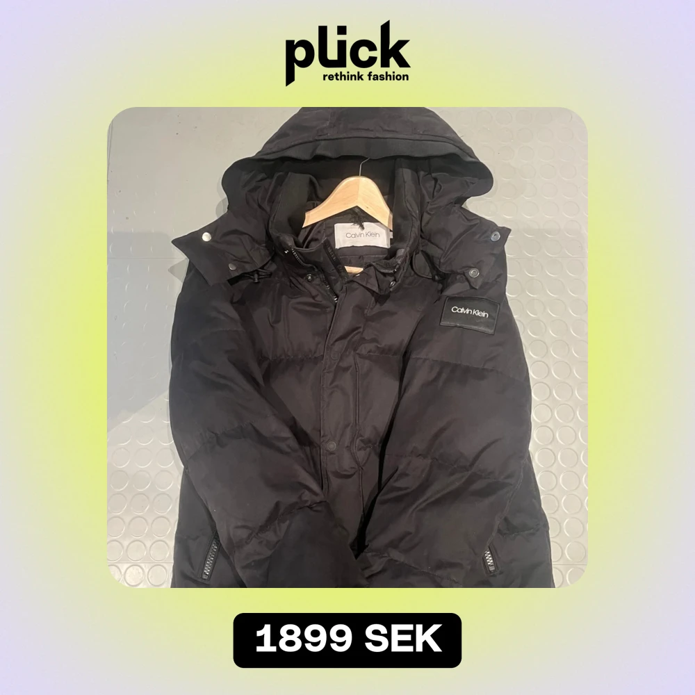 Säljer en snygg svart dunjacka från Calvin Klein. Den har en praktisk huva och dragkedja framtill. Perfekt för kalla vinterdagar. Jackan är i mycket bra skick och har en stilren design med märkets logga på vänstra armen. Den har en de effekt som är på bild 3💫