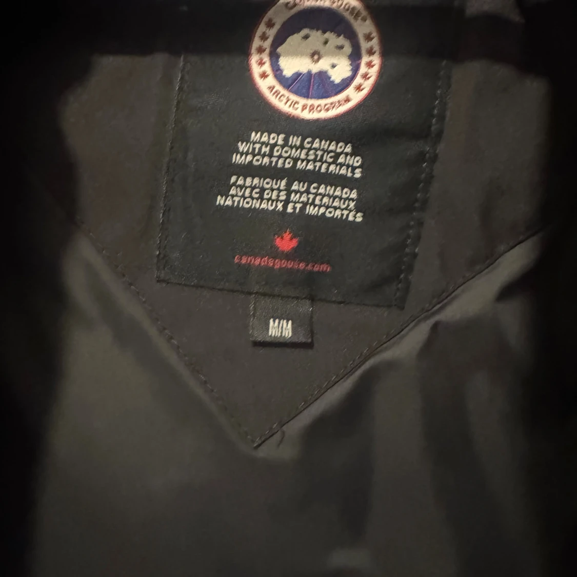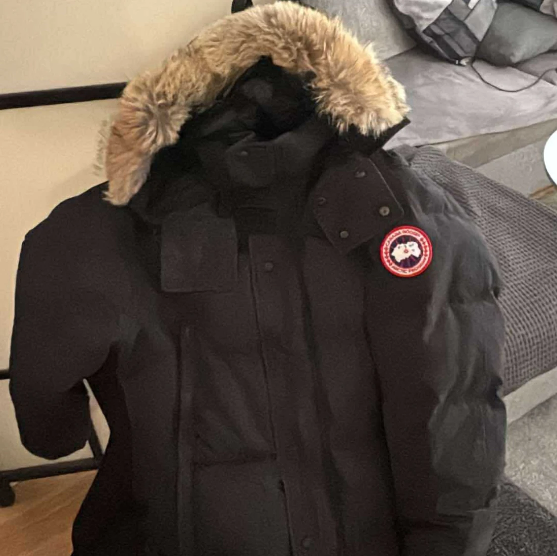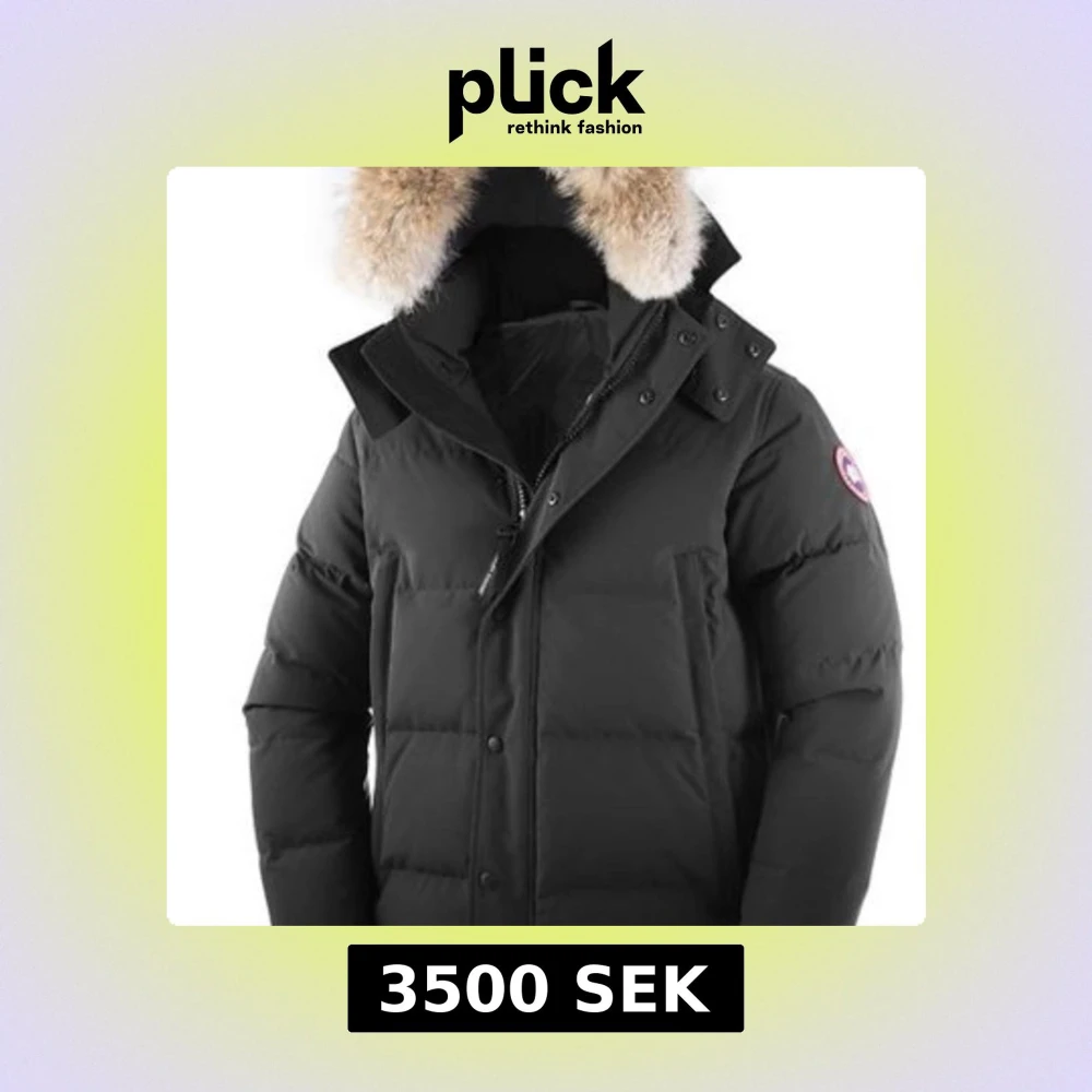 Svart dunjacka från Canada Goose med ikonisk patch på ärmen och fluffig päls runt huvan. Jackan har dragkedja och knappar framtill, långa ärmar med ribbade muddar och flera praktiska fickor. Perfekt för kalla vinterdagar och riktigt snygg streetstil.