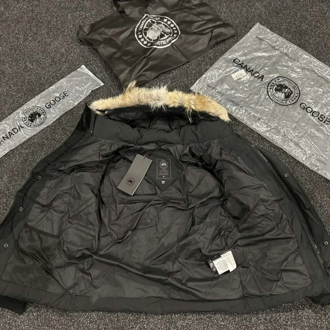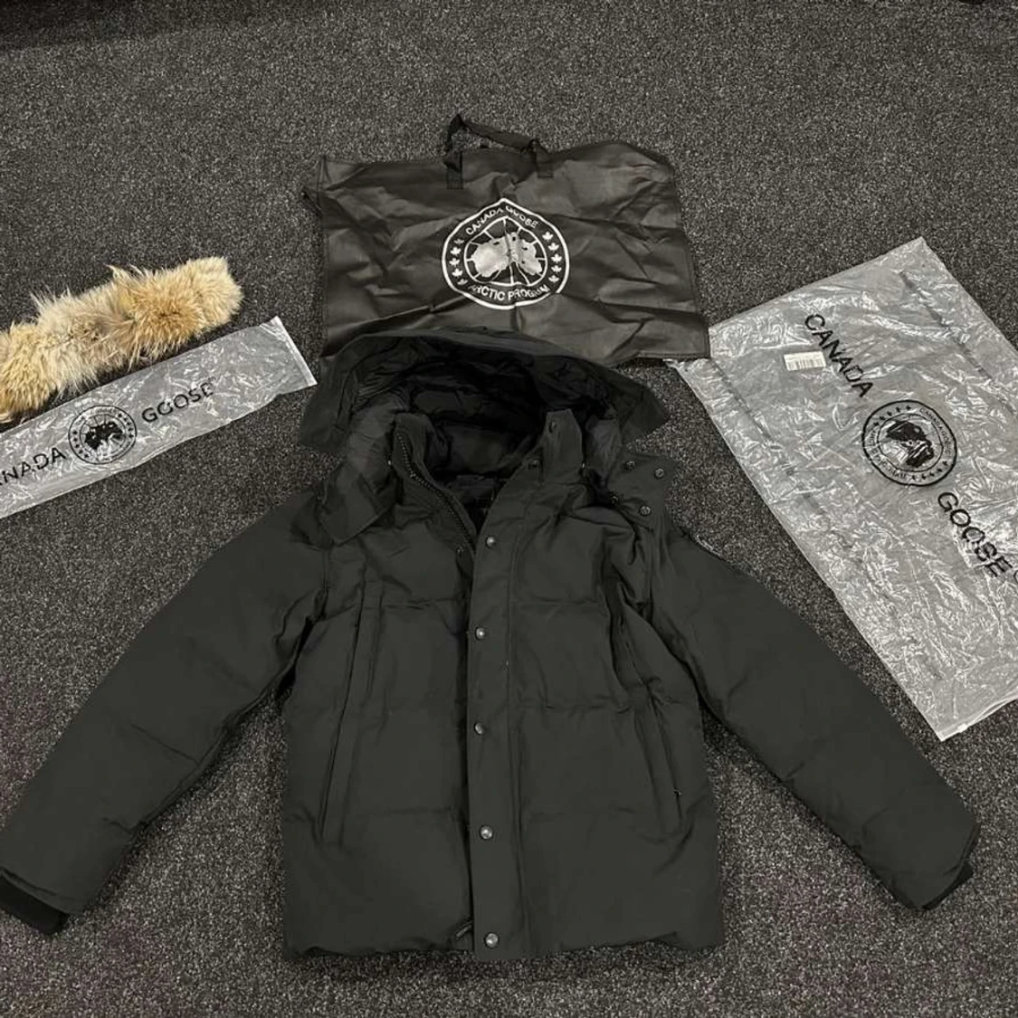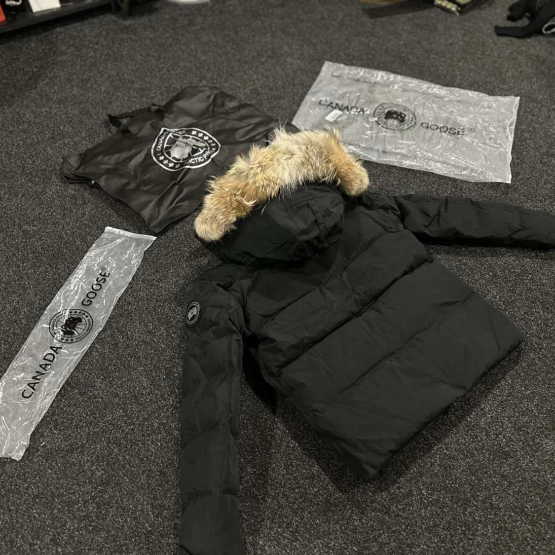 Svart dunjacka från Canada Goose med avtagbar huva och snygg pälsdetalj. Jackan har lång ärm, dragkedja och knappar framtill, samt logotyp på ärmen. Perfekt för kalla dagar med sin tjocka och quiltade design.