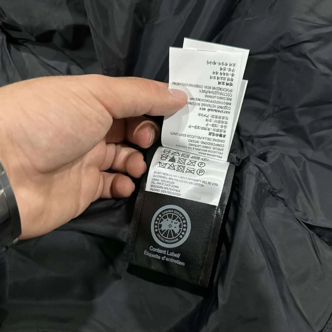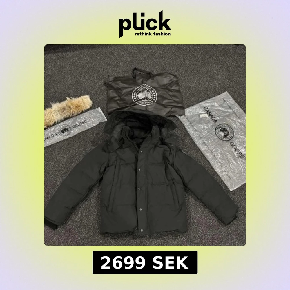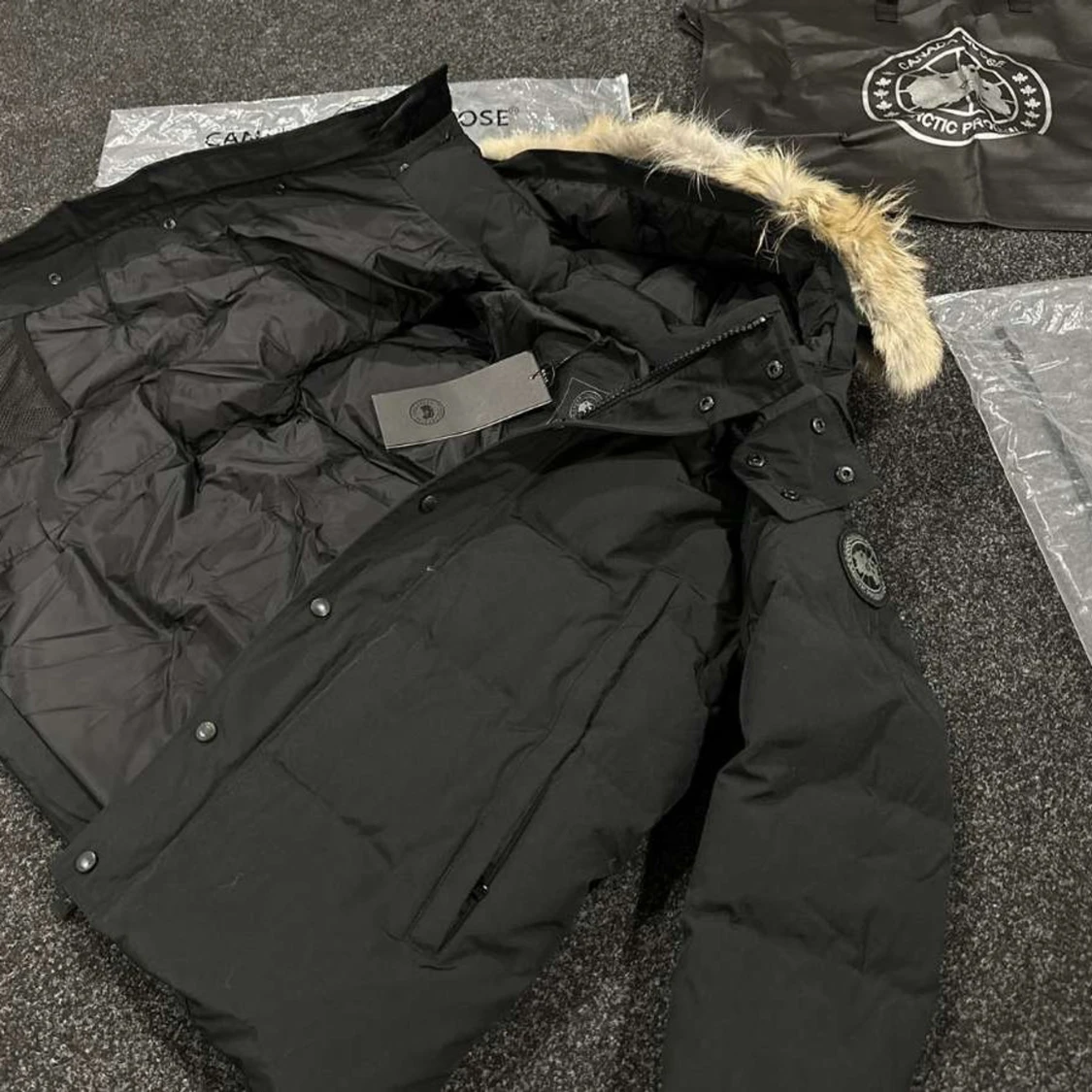 Svart dunjacka från Canada Goose med avtagbar huva och snygg pälsdetalj. Jackan har lång ärm, dragkedja och knappar framtill, samt logotyp på ärmen. Perfekt för kalla dagar med sin tjocka och quiltade design.