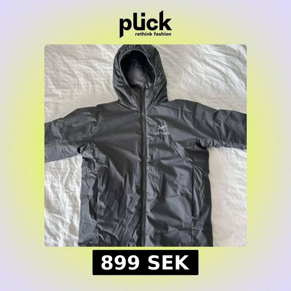 Säljer en svart dunjacka från Arc'teryx med huva och dragkedja. Perfekt för kyliga dagar med sin stilrena design och funktionella passform.