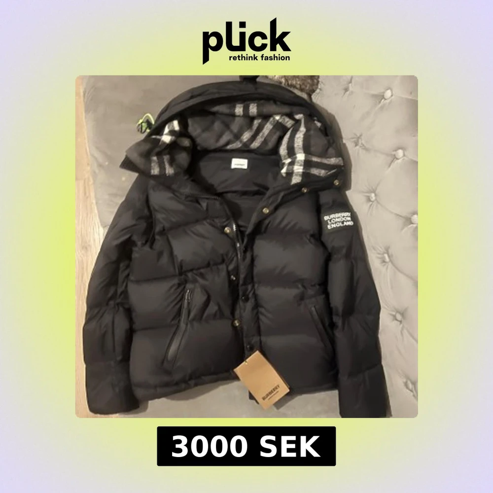 Ny svart dunjacka från Burberry med huva och dragkedja. Jackan har ett klassiskt rutigt mönster på insidan av huvan och Burberry-logga på bröstet. Perfekt för kyliga dagar/vinterjacka. Kan bli till väst. Har använt den i några dagar bara men fortfarande som ny. Storlek S och L kan fixas.