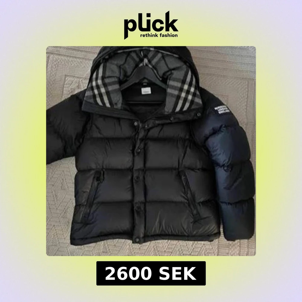 Snygg svart dunjacka från Burberry med avtagbara ärmar så du kan bära den som väst. Jackan har klassiskt rutigt foder i huvan, dragkedjor på fickorna och tryckknappar framtill. Perfekt för kalla dagar och riktigt stilren look.