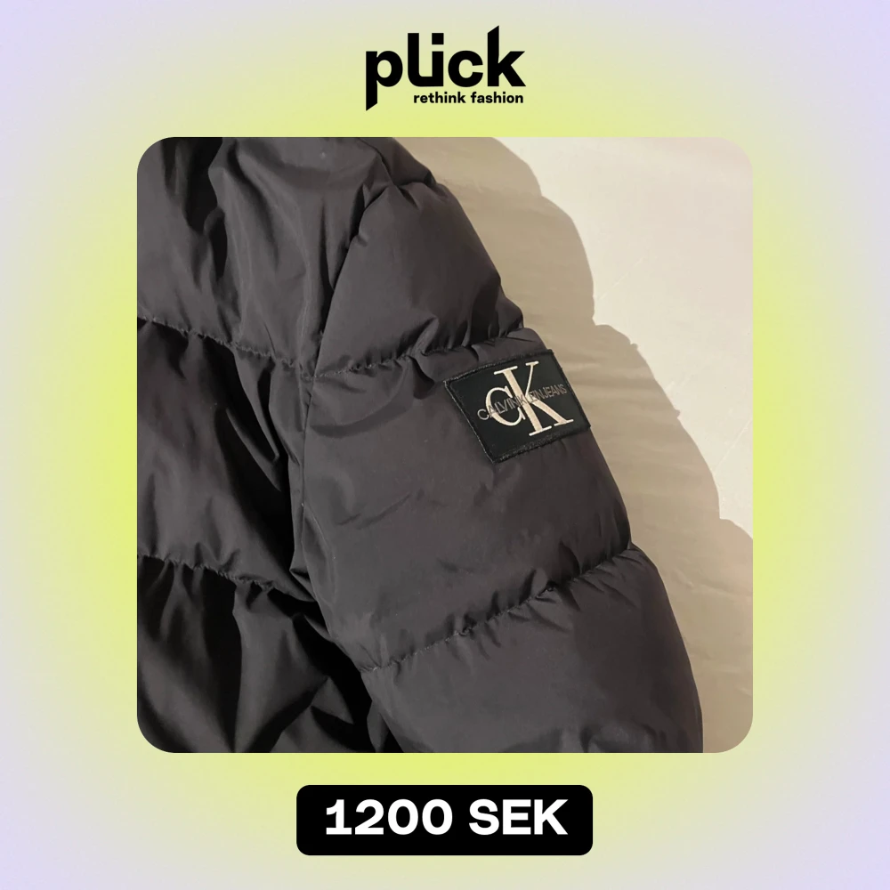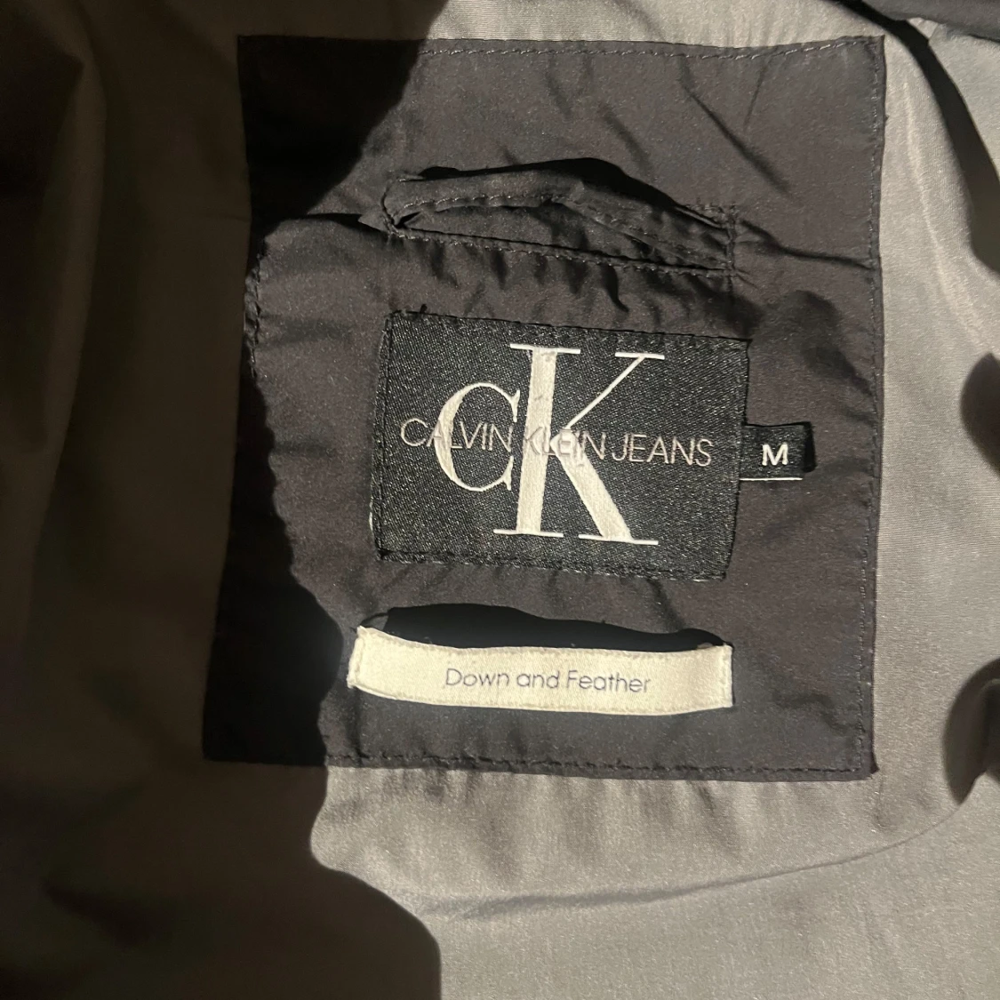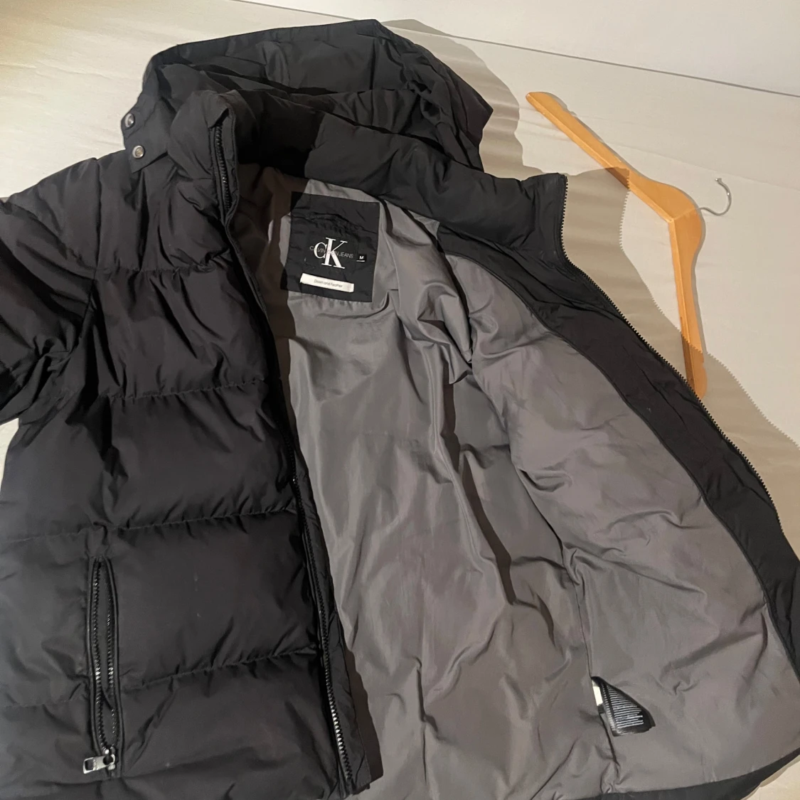 Säljer en snygg svart dunjacka från Calvin Klein i storlek M. Jackan har en pufferstil med dragkedja och huva, perfekt för kalla vinterdagar. Den är i mycket bra skick och har en stilren design med CK-logga på ärmen. Supervarm och bekväm! Priset kan diskuteras