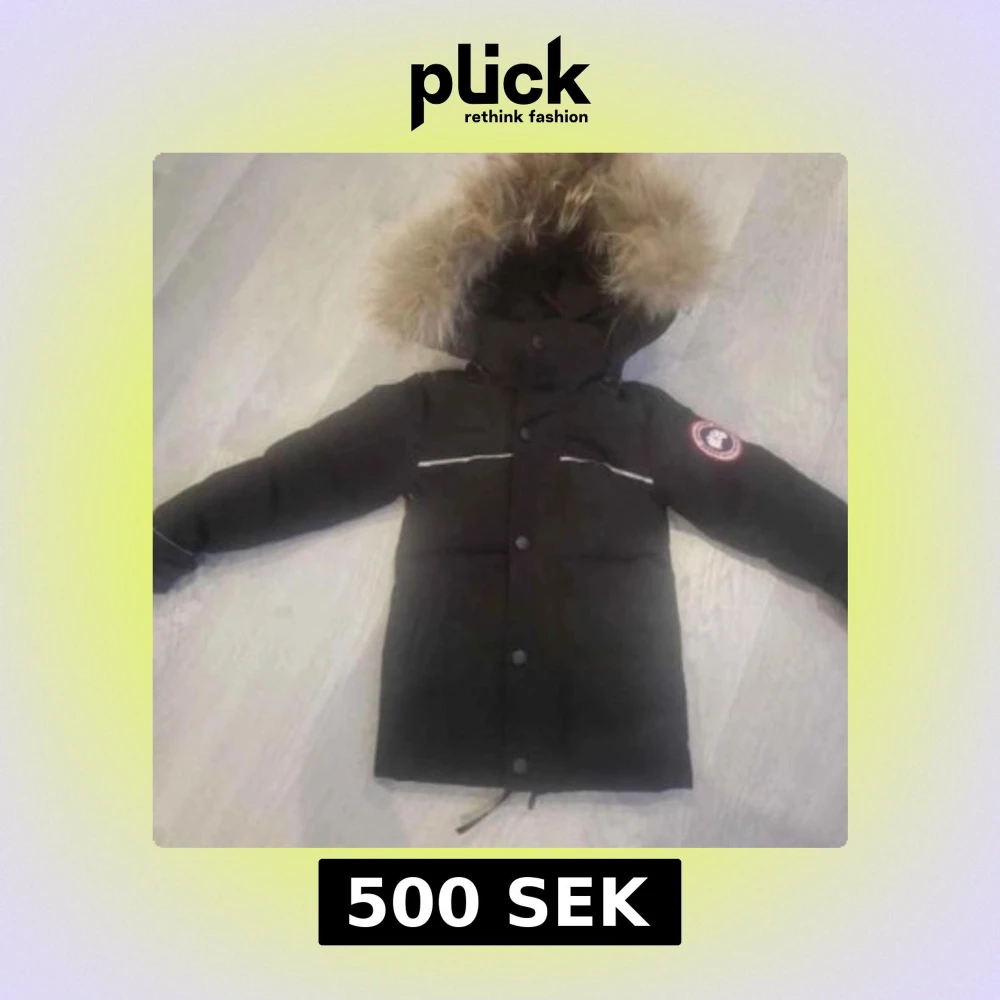 Säljer en svart dunjacka från Canada Goose med pälskantad huva. Jackan har en klassisk design med knappar och dragkedja framtill samt en logotyp på ärmen. Perfekt för kalla vinterdagar. OBS BARN JACKA ca 98 i vanlig strl!