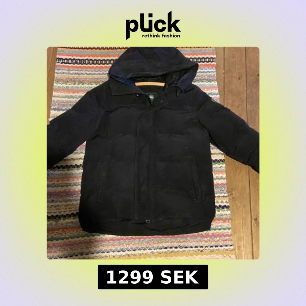 Säljer en svart dunjacka från Canada Goose med huva och diskret logga på ärmen. Jackan har dragkedja och knappar framtill, två fickor och är fodrad för extra värme. Perfekt för kalla dagar och har en clean, klassisk look.