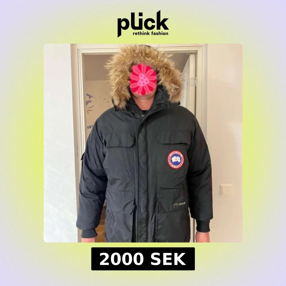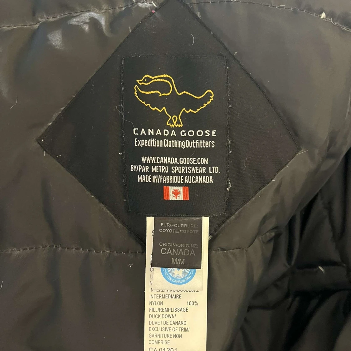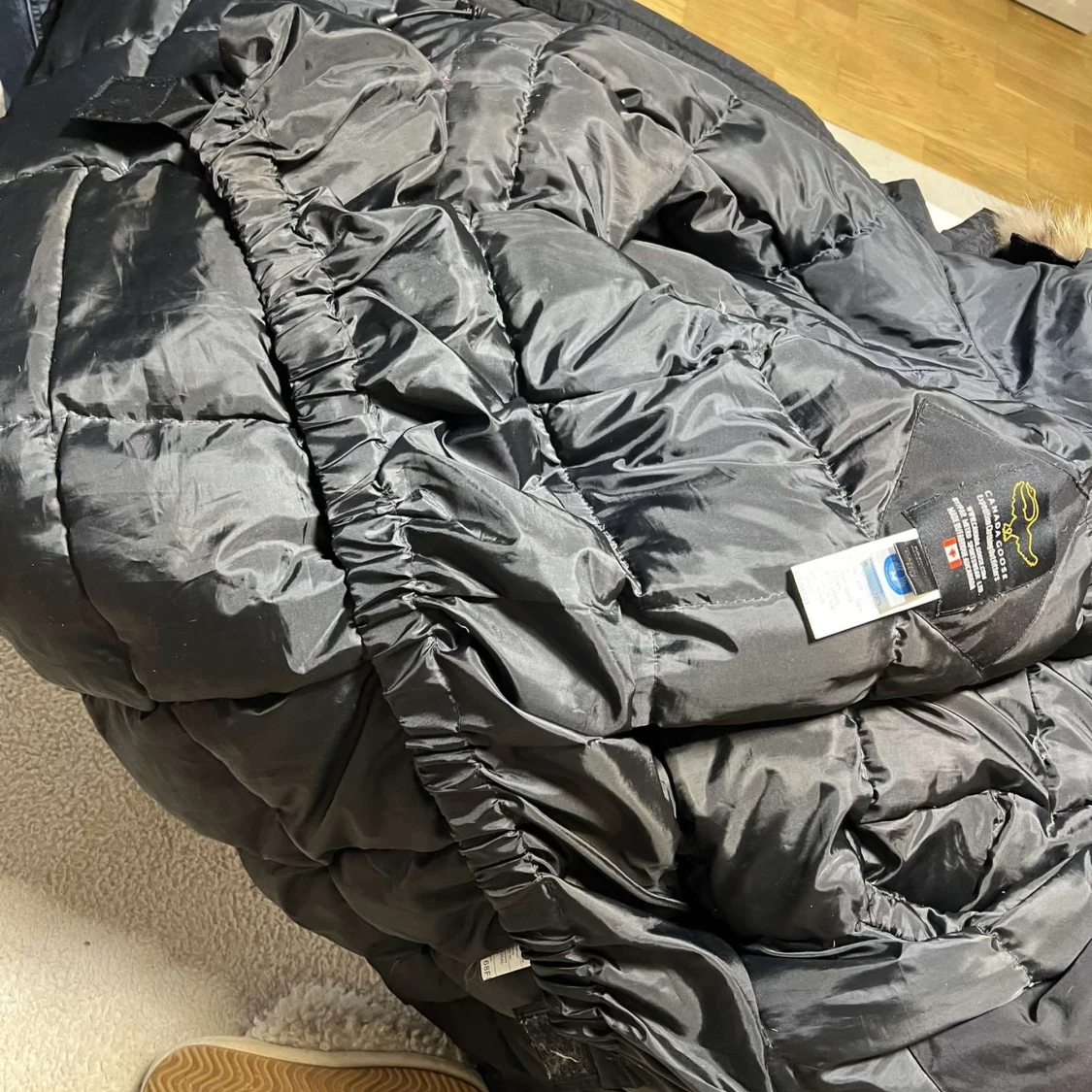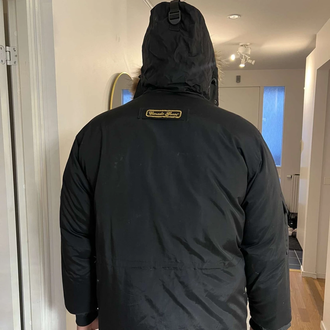 Säljer en svart dunjacka från Canada Goose med pälskantad huva. Jackan har en broderad logotyp på bröstet och flera praktiska fickor. Perfekt för kalla vinterdagar. (Defekt)🖤