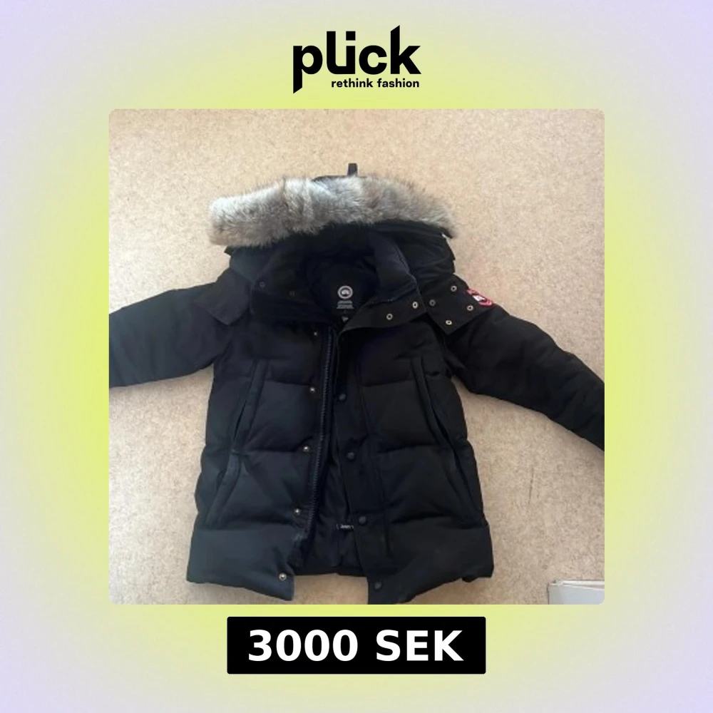 Säljer en svart dunjacka från Canada Goose med pälskantad huva. Det finns en skada på jackan och det är drag kedjan vid vänstra fickan som e trasig.