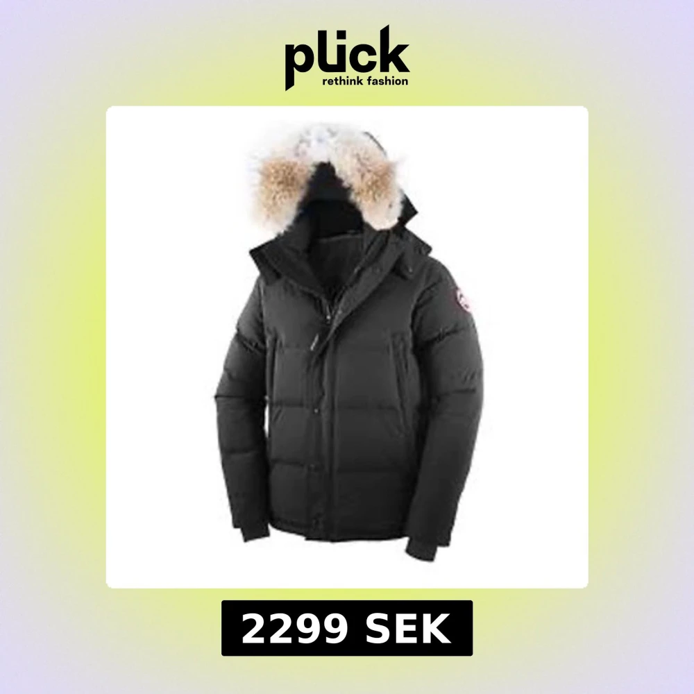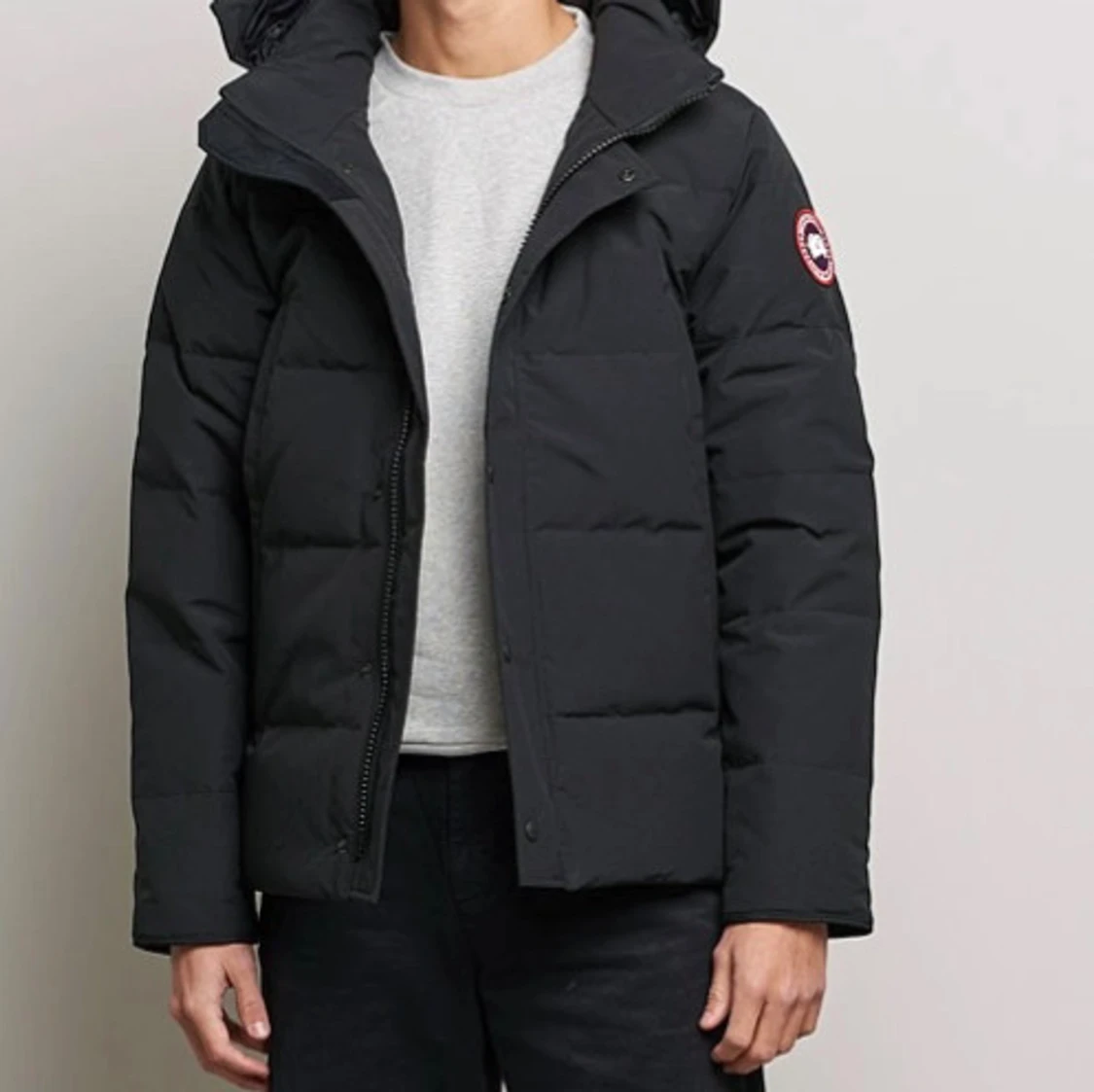 Säljer en svart dunjacka från Canada Goose med huva och snygg pälsdetalj. Jackan har ett klassiskt quiltat mönster, dragkedja och knappar framtill samt logotyp på ärmen. Perfekt för kalla vinterdagar och har en riktigt schysst passform.