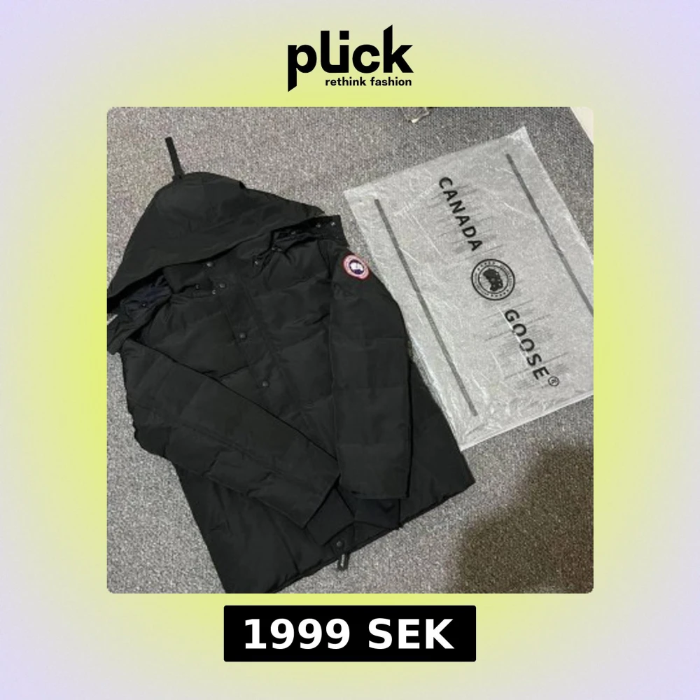 Säljer en svart dunjacka från Canada Goose med huva och klassisk logga på ärmen. Jackan har långa ärmar, knappar framtill och är perfekt för kalla dagar. Snygg och stilren design som håller dig varm hela vintern.