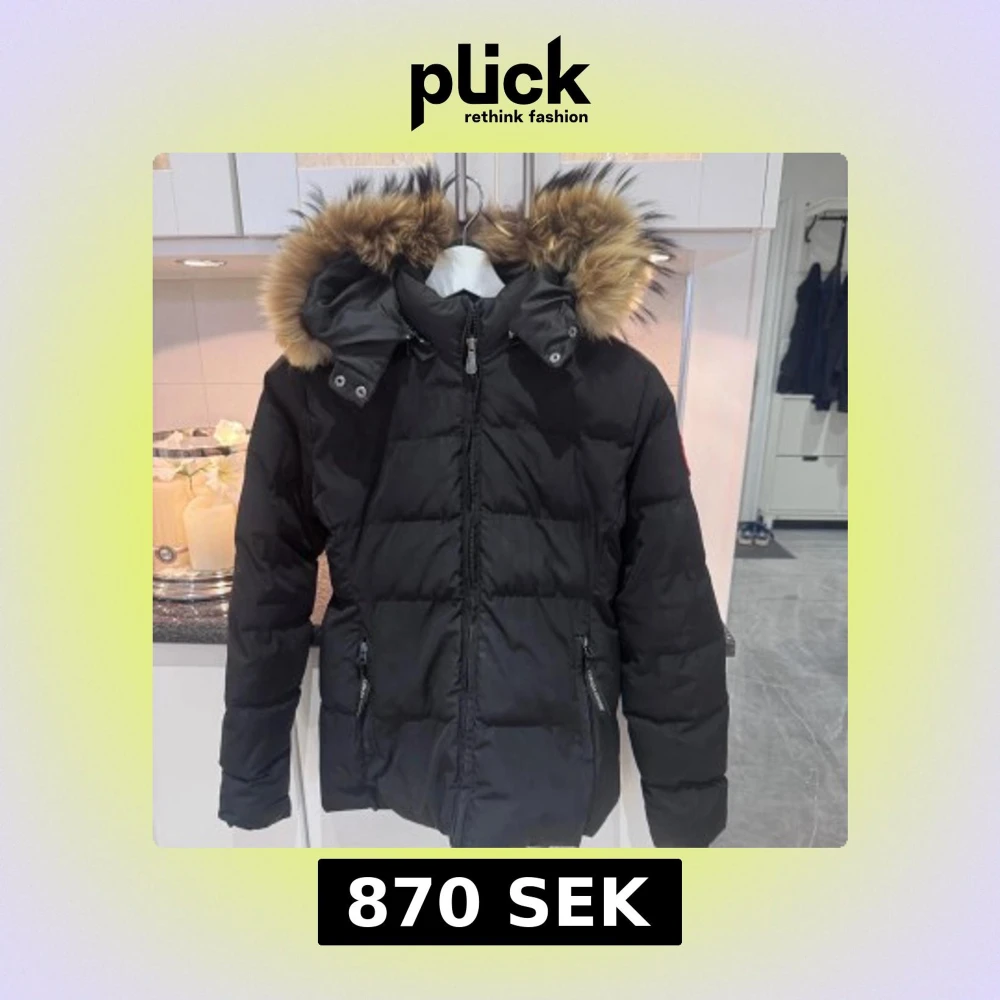 Säljer en svart dunjacka från Canada Goose med fluffig pälskant på huvan. Jackan har dragkedja framtill, två fickor med dragkedja och klassisk patch på ärmen. Perfekt för kalla vinterdagar och riktigt snygg streetstil. Storlek S