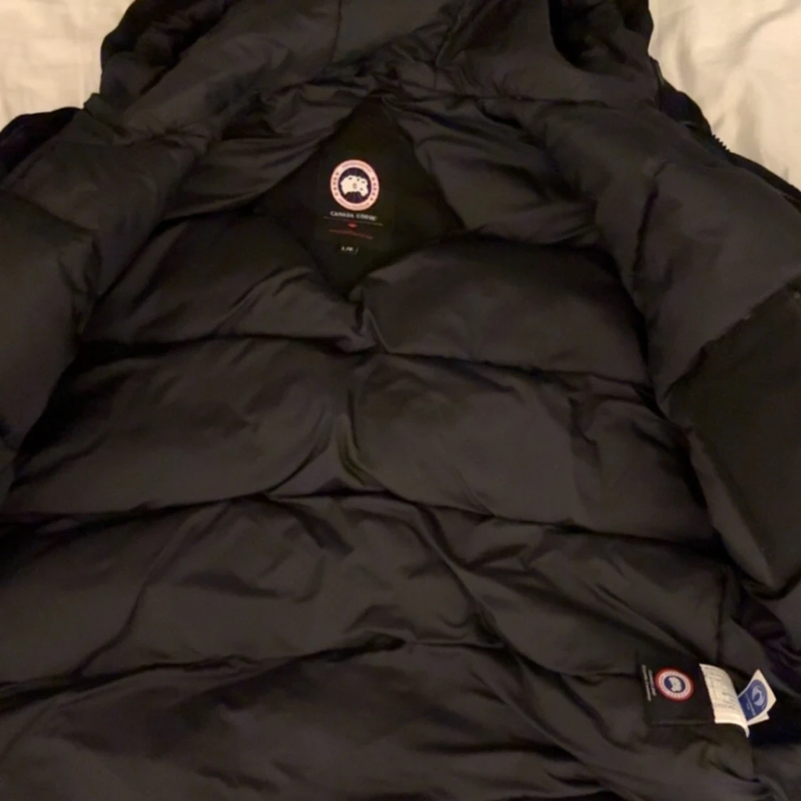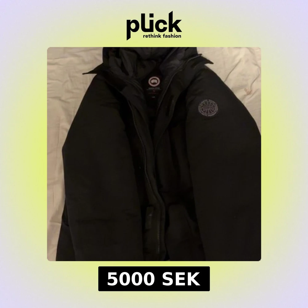 Säljer en svart dunjacka från Canada Goose i storlek L. Jackan har klassisk pufferdesign, huva och dragkedja framtill. Ikoniska Canada Goose-loggor syns på ärmen och insidan. Perfekt för kalla vinterdagar och riktigt snygg streetstil.